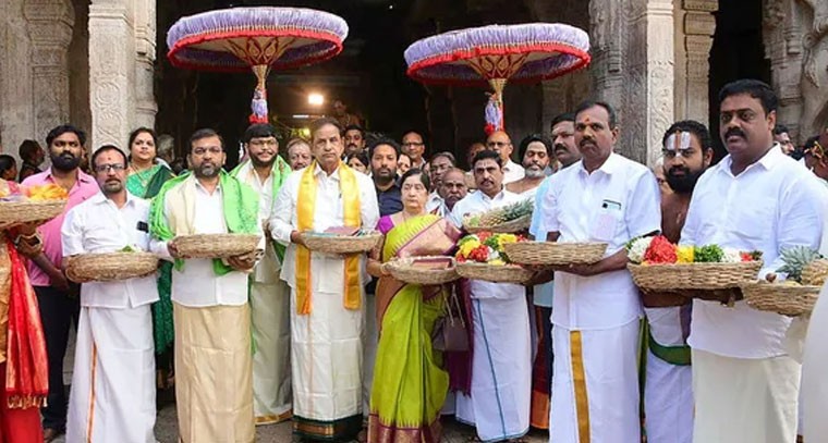 తిరుమల తిరుపతి దేవస్థానం (టిటిడి) చైర్మన్ బీఆర్ నాయుడు దంపతులు, తమిళనాడులోని శ్రీరంగం శ్రీరంగనాథస్వామివారి ఆలయంలో సోమవారం నాడు పట్టువస్త్రాలను సమర్పించారు. ఆలయ జాయింట్ కమిషనర్ పి. శివరామన్, ప్రధానార్చకులు సుందరభట్టర్ టిటిడి చైర్మన్ కు ఘన స్వాగతం పలికారు. చైర్మన్ తన దంపతులతో కలిసి పట్టువస్త్రాలను తలపై పెట్టుకుని ఊరేగింపుగా వెళ్లి స్వామివారికి సమర్పించారు. దర్శనం అనంతరం ఆలయ అధికారులు చైర్మన్ కు స్వామివారి తీర్థప్రసాదాలను అందజేశారు.