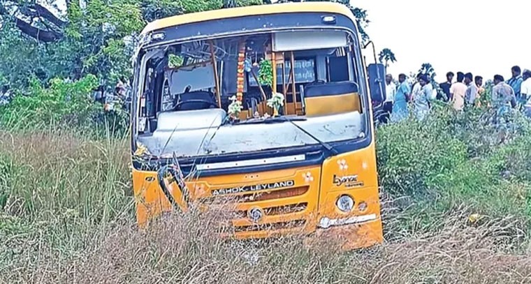 తమిళనాడులో రోడ్డు ప్రమాదం జరిగింది. రాణిపేట జిల్లా ఆర్కాడులో మహాలక్ష్మి మహిళా కళాశాల బస్సు సోమవారం 40మంది విద్యార్థినులను ఎక్కించుకుని వాలాజాపేట వైపు వెళ్తుండగా.. డ్రైవర్ రవి(70)కి జంబుకుళం కూడలి వద్ద కళ్లు తిరగడంతో బస్సు అదుపుతప్పి చింతచెట్టును ఢీకొంది. డ్రైవర్ బస్సును పొలంలోకి మళ్లించి ఆపగా, గుండెపోటుతో మృతి చెందినట్లు గుర్తించారు. విద్యార్థినులు సురక్షితంగా బయటపడ్డారు. శోళింగర్ పోలీసులు కేసు నమోదు చేసి దర్యాప్తు చేస్తున్నారు.