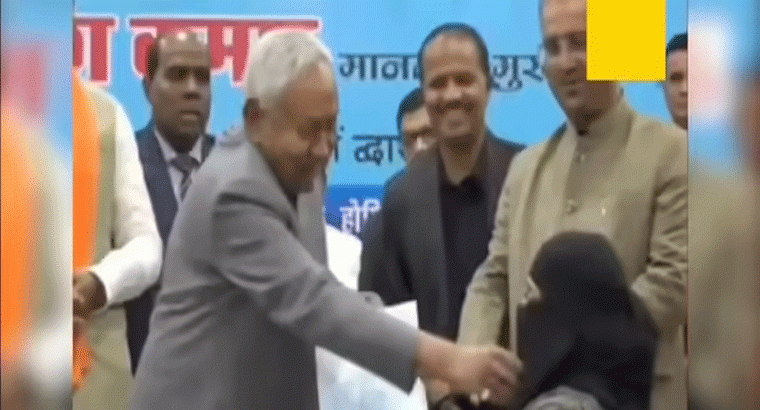 ఓ కార్యక్రమంలో బిహార్ ముఖ్యమంత్రి నితీష్ కుమార్ వ్యవహరించిన తీరుపై తీవ్ర దుమారం రేగుతోంది. డిసెంబరు 15న (సోమవారం) పట్నాలోని ముఖ్యమంత్రి నివాసంలో కొత్తగా ఎంపికైన ఆయుష్ వైద్యులకు నియామక పత్రాలను అందజేసే కార్యక్రమం జరిగింది. ఈ సందర్భంగా ఉద్యోగానికి ఎంపికైన ముస్లిం మహిళ హిజాబ్ ధరించి హాజరయ్యారు. ఆమెకు నియామక పత్రాన్ని అందజేసిన తర్వాత ముఖ్యమంత్రి ఆ మహిళ ధరించిన హిజాబ్ గురించి అడిగి, దానిని తీసివేయమని సూచించారు. ఆ వెంటనే ఆయనే స్వయంగా దానిని తొలగించారు. ఈ సందర్భంగా అక్కడున్న కొందరు నవ్వడంతో ఆమె కలత చెందారు. దీనికి సంబంధించిన వీడియో సోషల్ మీడియాలో వైరల్ కాగా.. ముఖ్యమంత్రి తీరుపై ప్రతిపక్షాలు తీవ్ర విమర్శలు గుప్పిస్తున్నాయి.