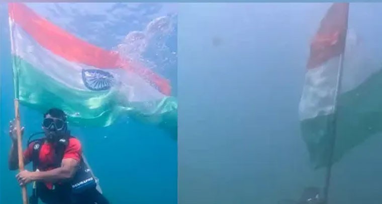 AP: 77వ గణతంత్ర దినోత్సవం సందర్భంగా విశాఖపట్నం తీరంలో అరుదైన దృశ్యం ఆవిష్కృతమైంది. నేవీ మాజీ అధికారి బలరాం నాయుడు నేతృత్వంలో ఐదుగురు స్కూబా డైవర్లు 77 అడుగుల లోతులో సముద్ర గర్భంలో జాతీయ జెండాను ఆవిష్కరించి దేశభక్తిని చాటుకున్నారు. దాదాపు అరగంట పాటు జరిగిన ఈ ప్రదర్శనలో ఇద్దరు డైవర్లు గుర్రంపై స్వారీ చేస్తున్నట్లుగా వినూత్న ప్రదర్శనతో ఆకట్టుకున్నారు. ధైర్యం, క్రమశిక్షణ, రాజ్యాంగం పట్ల గౌరవాన్ని చాటేందుకే ఈ కార్యక్రమం నిర్వహించినట్లు బలరాం నాయుడు తెలిపారు.