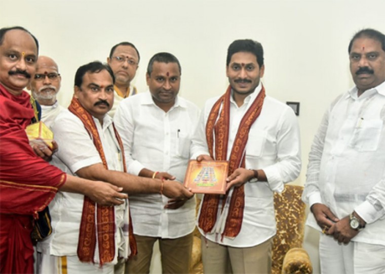 ముఖ్యమంత్రి జగన్మోహన్ రెడ్డిని దేవాదాయ శాఖ మంత్రి వెల్లంపల్లి శ్రీనివాస్, దుర్గమ్మ ఆలయ ఈవో సురేష్ బాబు, అర్చక స్వాములు ఎమ్మెల్యే మల్లాది విష్ణు లు కలిశారు. దుర్గమ్మ అమ్మవారి దేవి శరన్నవరాత్రి ఉత్సవాలకు రావాల్సిందిగా ఈ సందర్భంగా సీఎం జగన్ ను వారు ఆహ్వాన పత్రిక ను అందజేశారు.