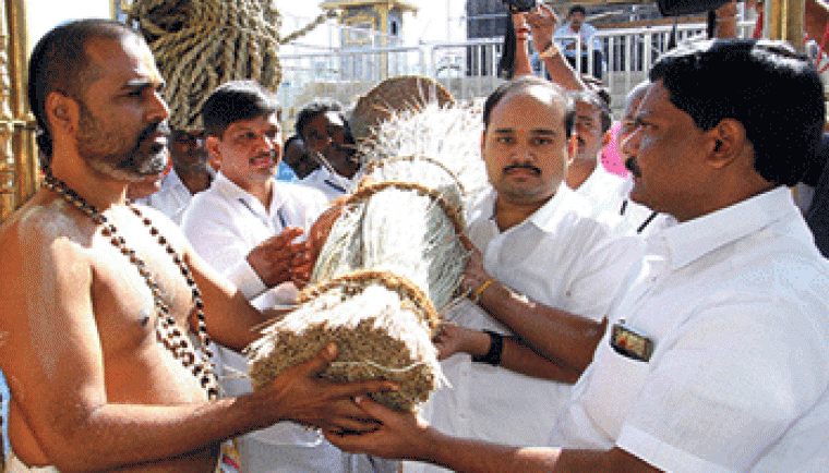 శ్రీవారి బ్రహ్మోత్సవాల్లో ఆగమోక్తంగా నిర్వహించే ధ్వజారోహణం కార్యక్రమం కోసం టిటిడి అటవీ విభాగం ఆధ్వర్యంలో పవిత్రమైన దర్భను సిద్ధం చేశారు. దర్భతో తయారుచేసిన చాప, తాడును శుక్రవారం టిటిడి డిఎఫ్వో శ్రీ డి.ఫణికుమార్నాయుడు ఆధ్వర్యంలో అటవీ విభాగం అధికారులు, సిబ్బంది ఊరేగింపుగా తీసుకొచ్చి శ్రీవారి ఆలయ డెప్యూటీ ఈవో శ్రీ హరీంద్రనాధ్కు అందించారు.