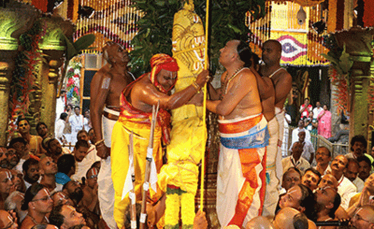 శ్రీదేవి, భూదేవి సమేత శ్రీమలయప్పస్వామివారి సమక్షంలో వేదగానాల మధ్య మంగళవాద్యాలు మోగుతుండగా అర్చకస్వాములు బంగారు ధ్వజస్తంభంపై గరుడధ్వజాన్ని ఎగురవేశారు. శ్రీ సీతారామాచారి కంకణభట్టర్గా వ్యవహరించారు. సకల దేవతలను, అష్టదిక్పాలకులను బ్రహ్మోత్సవాలకు ఆహ్వానించేందుకు ఈ కార్యక్రమం నిర్వహిస్తారని ప్రాశస్త్యం.