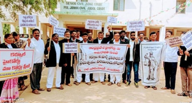 రాష్ట్ర హైకోర్టును రాజధాని అమరావతి నుండి కర్నూలుకు మార్చేందుకు ప్రభుత్వం ప్రయత్నించడాన్ని వ్యతిరేకిస్తూ కందుకూరు బార్ అసోసియేషన్ న్యాయవాదులు నిరసన కార్యక్రమం చేపట్టారు. కోర్టు విధులను బహిష్కరించిన న్యాయవాదులు కోర్టు భవనాల ప్రాంగణం ఎదుట ప్రభుత్వ చర్యను నిరసిస్తూ ధర్నా చేశారు. హైకోర్టును అమరావతిలోనే కొనసాగించాలని డిమాండ్చేశారు. హైకోర్టు మార్పు చర్యను ప్రభుత్వ అనాలోచిత చర్యగా విమర్శించిన న్యాయవాదులు రోడ్డు మీదకు వచ్చి కొంత సేపు రాస్తారోకో నిర్వహించారు. మూడు రోజులపాటు నిరసన కార్యక్రమం నిర్వహించిన అనంతరం ఆదివారం పరిస్థితి సమీక్షించుకొని తదుపరి కార్యాచరణ కొనసాగిస్తామని బార్ అసోసియేషన్ అధ్యక్షుడు సన్నెబోయిన శ్రీనివాసులు తెలిపారు. ప్రజల మనోభావాలకు వ్యతిరేకంగా వ్యవహరిస్తున్న ప్రభుత్వ దుందుడుకు చర్యను సహించేది లేదని న్యాయవాదులు స్పష్టంచేశారు. ఈ కార్యక్రమంలో బార్ అసోసియేషన్ అధ్యక్షుడు సన్నెబోయిన శ్రీనివాసులుతోపాటు సీనియర్ న్యాయవాదులు బెజవాడ కిష్టయ్య చౌదరి, వై.సాంబశివరావు, బచ్చలి మురళీకృష్ణ, సిహెచ్ హరికృష్ణ, కె.హరికోటేశ్వరరావు, రోశయ్య, షంషుద్దీన్, ప్రసాద్ రెడ్డి, పవన్కుమార్, తిరుమల రావు, పెట్లూరి మురళి, అరుణమ్మ, పవన్ తదితరులు పాల్గొన్నారు.
