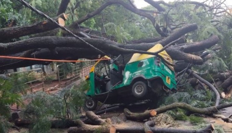 కర్ణాటక రాజధాని బెంగళూరులో గత రాత్రి కుంభవృష్టి కురిసింది. రాత్రంతా ఎడతెరపి లేకుండా పడిన వానకు తోడు బలమైన ఈదురు గాలులు వీయడంతో నగరంలోని పలు ప్రాంతాల్లో చెట్లు నేలకూలాయి. చెట్ల కొమ్మలు విరిగిపడ్డాయి. కాటన్ పెట్ ట్యాంక్ బండ్ రోడ్లో సైతం ఓ భారీ వృక్షం కూలీ ఆటోపై పడింది. అయితే ఈ ఘటనకు సంబంధించిన సమాచారం అందిన వెంటనే స్థానిక పోలీసులు ఘటనా ప్రాంతానికి చేరుకుని ఆటోడ్రైవర్, ప్రయాణికులను సురక్షితంగా వెలికితీశారు. అనంతరం వృక్షాన్ని ముక్కలు చేసి రోడ్డు క్లియర్ చేశారు. ఈ ఘటనలో ఆటో బాగా దెబ్బతిన్నది. కానీ ఎవరికీ ఎలాంటి గాయాలు కాలేదు.