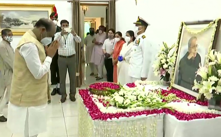 మాజీ రాష్ట్రపతి, రాజకీయ దురంధరుడు ప్రణబ్ ముఖర్జీ పార్థీవ దేహాన్ని న్యూఢిల్లీ ఆర్మీ ఆసుపత్రి నుంచి 10 రాజాజీ మార్గ్లోని అధికారిక నివాసానికి మంగళవారం ఉదయం అధికారులు తరలించారు. ఆయన పార్థీవ దేహానికి పలువురు ప్రముఖులు శ్రద్ధాంజలి ఘటించారు. ముందుగా చీఫ్ ఆఫ్ డిఫెన్స్ స్టాఫ్ (CDs) బిపిన్ రావత్, ఆర్మీ చీఫ్ జనరల్ ఎంఎం నరవాణే, ఎయిర్ఫోర్స్ ఎయిర్ చీఫ్ మార్షల్ ఆర్కేఎస్ భదౌరియా, నేవీ చీఫ్ అడ్మిరల్ కరంబీర్ సింగ్ నివాళులర్పించారు. అనంతరం రక్షణ మంత్రి రాజ్నాథ్ సింగ్ ప్రణబ్ ముఖర్జీకి నివాళులర్పించారు. అనంతరం లోక్సభ స్పీకర్ ఓం బిర్లా నివాళులర్పించారు.