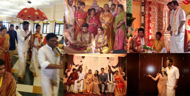 కోలీవుడ్ నటుడు, నడిగర్ సంఘం ప్రధాన కార్యదర్శి, తమిళ నిర్మాతల సంక్షేమ సంఘం అధ్యక్షుడు విశాల్ సోదరి ఐశ్వర్య వివాహం ఈ రోజు ఎంఆర్సీ మండపంలో క్రితీష్తో గ్రాండ్గా జరిగింది. పలువురు సినీ సెలబ్రిటీలు ఈ వేడుకకి హాజరై వధూ వరులను ఆశీర్వదించారు. అంతకు ముందు రోజు మెహందీ మరియు సంగీత్ వేడుకలని గ్రాండ్గా నిర్వహించినట్టు తెలుస్తుంది. విశాల్ ప్రస్తుతం తుప్పరివాలన్ అనే చిత్రం చేస్తున్నాడు. మిస్కీన్ దర్శకత్వంలో ఈ మూవీ రూపొందుతుంది. మరో వైపు విలన్ అనే చిత్రంలోను కీలక పాత్ర చేస్తున్నాడు.