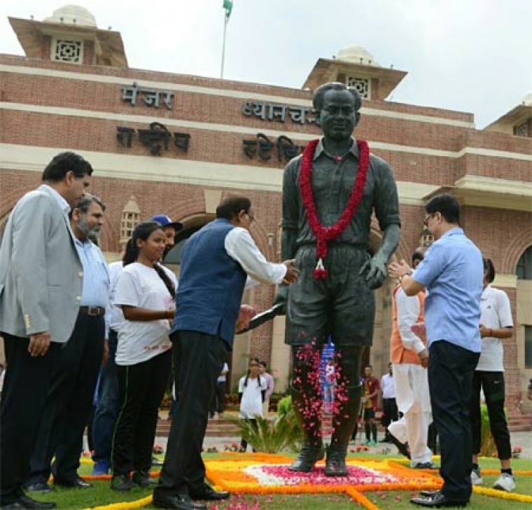 న్యూఢిల్లీ: ఇవాళ నేషనల్ స్పోర్ట్స్ డే. హాకీ ప్లేయర్ మేజర్ ధ్యాన్చంద్ జయంతి. ఈ నేపథ్యంలో కేంద్ర క్రీడాశాఖ మంత్రి విజయ్ గోయల్, హోంశాఖ మంత్రి కిరణ్ రిజిజులు ఇవాళ ఢిల్లీలోని హాకీ స్టేడియంలో మేజర్ ధ్యాన్చంద్ విగ్రహానికి పూలమాల వేసి నివాళి అర్పించారు. ఆ తర్వాత స్టేడియంలో జరిగిన కార్యక్రమంలో మంత్రులు మాట్లాడారు. స్పోర్ట్స్ కల్చర్తో పాటు క్రీడల్లో టెక్నాలజీ అన్న అంశంపై తమ అభిప్రాయాలను వినిపించారు. నేషనల్ స్పోర్ట్స్ ట్యాలెంట్ సెర్చ్ పోర్టల్ ను కేంద్ర క్రీడాశాఖ మంత్రి ప్రారంభించారు. ఇవాళ సాయంత్రం 4 గంటలకు ఖేల్ రత్న, అర్జున, ద్రోణాచార్య అవార్డులను కూడా బహూకరించనున్నారు
