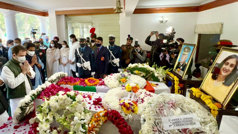 సిడిఎస్ జనరల్ బిపిన్ రావత్ జీ మరియు ఆయన భార్య శ్రీమతి మధులికా రావత్ జీ పూలమాలలు వేసి నివాళులర్పించిన రాహుల్ గాంధీ . బిపిన్ రావత్ జీ అందించిన సహకారాన్ని దేశం ఎప్పటికీ మరచిపోదు.