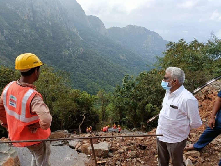 తిరుమల/డి.ఎన్.ఎ.టివి ఘాట్ రోడ్డు మరమ్మత్తు పనులను పరిశీలించిన టీటీడీ చైర్మన్ వైవీ సుబ్బారెడ్డి.ఇటీవల కురిసిన భారీ వర్షాల కారణంగా తిరుమల అప్ ఘాట్ రోడ్డులో కొండ చరియలు విరిగిపడి ధ్వంసమైన ప్రాంతాలను పరిశీలింలించి, మరమత్తు పనులు చేస్తున్న ఆఫ్కాన్ సంస్థ కు చెందిన కార్మికులతో మాట్లాడి బండరాళ్లను ఎలా తొలగిస్తున్నారు? రాళ్ళు కిందకు పడకుండా వాల్ కాంక్రీటు ఎలా చేస్తున్నారు? ఎంత మంది పనిచేస్తున్నారు? అనే వివరాలు అడిగి తెలుసుకున్న టీటీడీ చైర్మన్ వైవీ సుబ్బారెడ్డి.