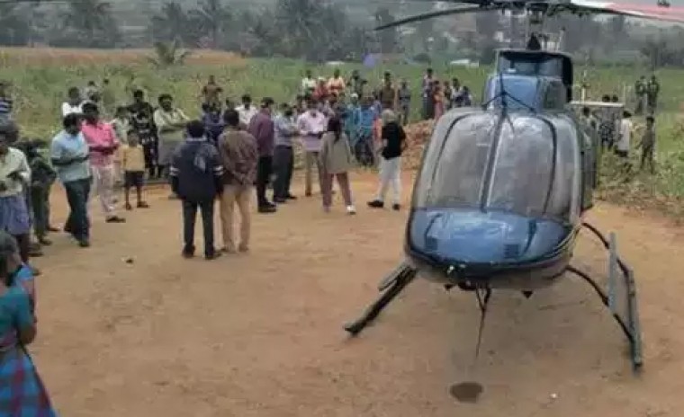 విమాన, హెలికాప్టర్ ప్రయాణాలు ఎంతటి సుఖాంతంగా ఉంటాయో వాతావరణ సహకరించకుంటే అంతే నష్టాలను ఎదుర్కోవాల్సి వస్తుంది. ఇప్పటి వరకు జరిగిన విమాన, హెలికాప్టర్ ప్రమాదాలన్నీ దాదాపు వాతావరణం సహకరించకపోవడంవల్లే జరిగాయి. ఇదిలావుంటే ఓ ప్రయివేట్ హెలికాప్టర్ ఉన్నట్టుండి పొలాల్లో ల్యాండ్ కావడంతో చుట్టుపక్కల పనిచేసుకుంటున్న రైతులు ఆశ్చర్యానికి గురయ్యారు. తొలుత భయపడిన జనం అక్కడకు చేరుకుని అందులోని వారు సురక్షితంగా ఉండటంతో ఊపిరిపీల్చుకున్నారు. ఈ ఘటన తమిళనాడులోని ఈరోడ్ జిల్లా సత్యమంగళం అటవీ ప్రాంతంలో శనివారం చోటుచేసుకుంది. బెంగళూరు నుంచి కొచ్చి వెళుతున్న ప్రైవేటు హెలికాప్టర్ ప్రతికూల వాతావరణం కారణంగా కడంబూర్ కొండ ప్రాంతం పరిధిలోని పవలకుట్టై గ్రామ పొలాల్లో ల్యాండ్ అయింది. కర్ణాటకకు చెందిన భరత్ (65) అనే వ్యక్తి తన భార్య షీలా (60) అనారోగ్యానికి గురికావడంతో చికిత్స కోసం కేరళలోకి కొచ్చికి తీసుకెళ్లాలని భావించారు. దీంతో ప్రైవేటు హెలికాప్టర్ను అద్దెకు తీసుకుని బెంగళూరు నుంచి బయలుదేరారు. అయితే, హెలికాప్టర్ కడంబూర్ కొండ ప్రాంతం గుండా వెళుతుండగా మేఘాలు కమ్ముకోవడం, మంచు, ప్రతికూల వాతావరణం కారణంగా సిగ్నల్స్ అందలేదు. దీంతో పైలెట్ జస్పాల్ సమీపంలోని పొలాల్లో హెలికాప్టర్ను ల్యాండ్ చేశారు. హెలికాప్టర్ ల్యాండ్ కావడం గమనించిన అక్కడ పనిచేస్తున్నవారు ఆందోళనకు గురయ్యారు. అక్కడకు చేరుకుని హెలికాప్టర్లోని నలుగురు సురక్షితంగా బయటకు రావడంతో ఊపిరి పీల్చుకున్నారు. హెలికాప్టర్లో భరత్, షీలాతోపాటు పైలెట్, ఇంజినీర్ ఉన్నారు. విషయం తెలుసుకున్న పోలీసులు ఘటనా స్థలానికి చేరుకుని పరిశీలించారు. చుట్టుపక్కలవారు భారీగా గుమిగూడటంతో పోలీసులు వారిని అక్కడి నుంచి పంపించేశారు. శనివారం ఉదయం 10.30 గంటల నుంచి దాదాపు మూడు గంటలపాటు అక్కడే హెలికాప్టర్లో నిలిచిపోగా.. వాతావరణం అనుకూలించిన తర్వాత అక్కడ నుంచి బయలుదేరి కొచ్చి చేరుకున్నారు.