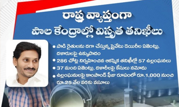 రాష్ట్రంలో ప్రైవేట్ గా వ్యవసాయ రంగానికి సంబంధించి పాల ఉత్పత్తి కేంద్రాలు నడిపే వారు తక్కువ ఏమి కాదు. ఈ మధ్య కాలంలో జగన్ ప్రభుత్వం అమూల్య కేంద్రాలుగా గ్రామాలలో పాల కేంద్రాలను ఏర్పాటు చెయ్యడం జరిగింది. ఈ నేపథ్యంలో రాష్ట్రవ్యాప్తంగా పాల కేంద్రాల్లో విస్తృతంగా అధికారులు తనిఖీలు నిర్వహించారు. పాడి రైతుకు మేలు జరిగేలా చర్యలు చేపట్టినాము అని రాష్ట్ర ప్రభుత్వం తెలియ చేస్తుంది. మొత్తం 286 చోట్ల నిర్వహించిన ఆకస్మిక తనిఖీల్లో 57 ఉల్లంఘనలు, కేసులు నమోదుతో పాటు భారీగా జరిమానాలు వసూలు చెయ్యడం జరిగింది.