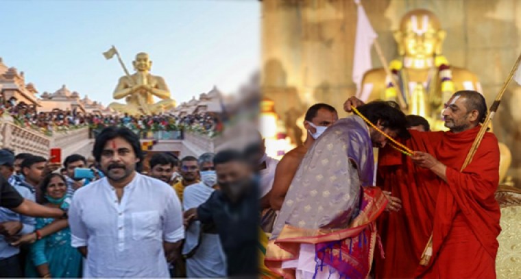 ముచ్చింతల్లోని శ్రీరామనగరంలో జరిగిన శ్రీరామానుజాచార్య సహస్రాబ్ది వేడుకలకు జనసేనా అధినేత పవన్ కళ్యాణ్ హాజరయ్యారు. ఈ సందర్భంగా పవన్ కళ్యాణ్ అక్కడ ఏర్పాటు చేసిన సమతామూరి విగ్రహాన్ని సందర్శించారు.అంతేకాకుండా విగ్రహం చుట్టూ నిర్మించిన 108 మందిరాలను కూడా సందర్శించి పూజలు చేశారు. చినజీయర్ స్వామి ఆశీస్సులు కూడా పొందారు.తమ ఆశ్రమానికి వచ్చిన జనసేన అధినేత పవన్ కళ్యాణ్ కు చినజీయర్ స్వామి శాలువా కప్పి సన్మానించారు.