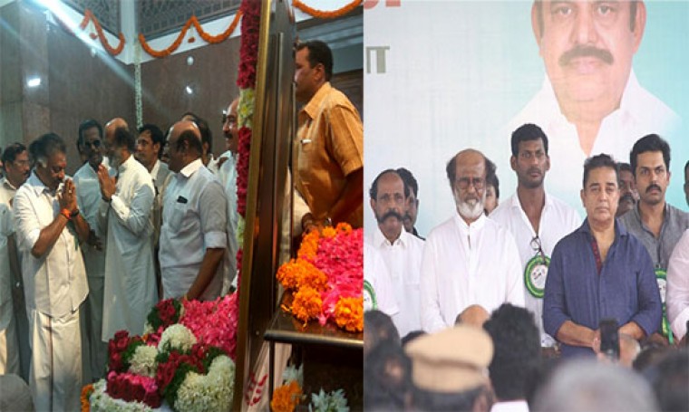 చెన్నైలో నేడు జరిగిన శివాజీ మెమోరియల్ ప్రారంభోత్సవ వేడుకకు సూపర్ స్టార్లు కమల్ హాసన్, రజనీకాంత్ లతో పాటు తమిళనాడు ఉప ముఖ్యమంత్రి పన్నీర్ సెల్వం హాజరయ్యారు. శివాజీ గణేశన్ కుమారుడు ప్రభు ఆహ్వానం మేరకు పలువురు సినీ ప్రముఖులు, రాజకీయ నాయకులు ఈ కార్యక్రమానికి వచ్చారు. గత సంవత్సరం ఆగస్టు 4న చెన్నై, కామరాజర్ సారైలోని శివాజీ విగ్రహాన్ని హైకోర్టు ఆదేశాల మేరకు వేరేచోటికి తరలించిన సంగతి తెలిసిందే. దీనిపై ఆయన అభిమానుల్లో వెల్లువెత్తిన ఆగ్రహాన్ని చల్లార్చేందుకు పబ్లిక్ వర్క్ విభాగం అడయార్ లో సుమారు రూ. 3 కోట్ల ఖర్చుతో 28,300 చదరపు అడుగుల్లో శివాజీ స్మారకాన్ని నిర్మించింది. దీని ప్రారంభోత్సవ కార్యక్రమానికి రావాలని ప్రభు స్వయంగా వెళ్లి సీఎం పళనిస్వామిని కోరగా, ఆయన నిరాకరించినప్పుడూ శివాజీ అభిమానులు తీవ్ర ఆగ్రహాన్ని వ్యక్తం చేశారు. తన ముందస్తు కార్యక్రమాల కారణంగా రాలేకపోతున్నానని వివరణ ఇచ్చుకున్న పళనిస్వామి, తన ప్రతినిధిగా పన్నీర్ ను పంపుతున్నట్టు స్వయంగా ప్రభు ఇంటికి వెళ్లి మరీ చెప్పొచ్చారు. ఇక నేటి కార్యక్రమంలో శివాజీ గణేశన్ తో తమ అనుబంధాన్ని గుర్తు చేసుకున్న రజనీకాంత్, అభిమానుల మనసులో ఆయన స్థానం సుస్థిరమైనదని వ్యాఖ్యానించారు. తాను రాజకీయాల్లోకి వస్తున్నానని కమల్ హాసన్ స్పష్టమైన ప్రకటన చేసిన తరువాత, రజనీకాంత్ తో కలసి వేదికను పంచుకోవడం ఇదే తొలిసారి కావడం గమనార్హం.