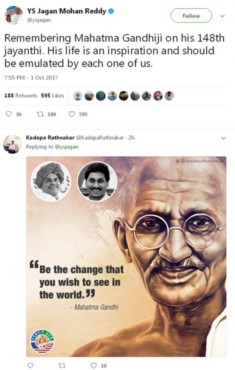 జాతిపిత మహాత్మాగాంధీ జయంతి సందర్భంగా వైసీపీ అధినేత జగన్ మహాత్మాగాంధీకి ఘన నివాళి అర్పించారు. ఈ సందర్భంగా ఆయన ఒక ట్వీట్ చేశారు. మహాత్మాగాంధీ 148 జయంతి సందర్భంగా ఆయనను స్మరించుకోవడం మనందరి కర్తవ్యమని ట్విట్టర్లో తెలిపారు. ఆయన జీవితం ప్రతి ఒక్కరికి స్ఫూర్తిదాయకమని చెప్పారు. అందరిలోనూ ఆయన స్ఫూర్తి నిండాలని ఆకాంక్షించారు. మహాత్ముడి జయంతి సందర్భంగా ఆయనను అందరూ స్మరించుకుందామని తెలిపారు. ఇదే సమయంలో లాల్ బహదూర్ శాస్త్రి జయంతి సందర్భంగా కూడా నివాళి అర్పించారు.