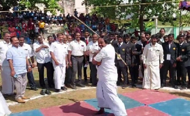 కొన్ని సంప్రదాయ క్రీడలు మనం ఎంత స్తాయికి ఎదిగిన అవి మాత్రం మన నుంచి దూరం కావు. తమిళనాడులోని నాగర్ కోయిల్ లో ప్రాచీన యుద్ధ కళా విద్యల పోటీలు నిర్వహిస్తున్నారు. లెమురియా వర్మకళారి ఆదిమురై ఫౌండేషన్ ఆధ్వర్యంలో ఈ పోటీలు జరుగుతున్నాయి. ఈ కార్యక్రమానికి తమిళనాడు ఐటీ మంత్రి మనో తంగరాజ్ హాజరయ్యారు. సంప్రదాయ పంచెకట్టుతో విచ్చేసిన ఆయన బరిలో దిగి కర్రసాముతో అలరించారు. మంత్రి ఎంతో వేగంగా కర్రసాము చేయడం చూసి అక్కడి వారు ఆశ్చర్యపోయారు. సింగిల్ హ్యాండ్, డబుల్ హ్యాండ్ విన్యాసాలతో మంత్రి మనో తంగరాజ్ ఎంతో ఉత్సాహంగా కదిలారు. దీనికి సంబంధించిన వీడియోను ఆయన తన ట్విట్టర్ అకౌంట్ లో పంచుకున్నారు. ఇదిలావుంటే లెమురియా ఫౌండేషన్ లో ఆదిమురై, సిలంబం, వర్మమ్, ఆదిమురై యోగా, కలరి, పరై ఇసై వంటి ప్రాచీన విద్యల్లో శిక్షణ ఇస్తారు. శిక్షణ పొందిన వారి మధ్య పోటీలు కూడా నిర్వహిస్తుంటారు.