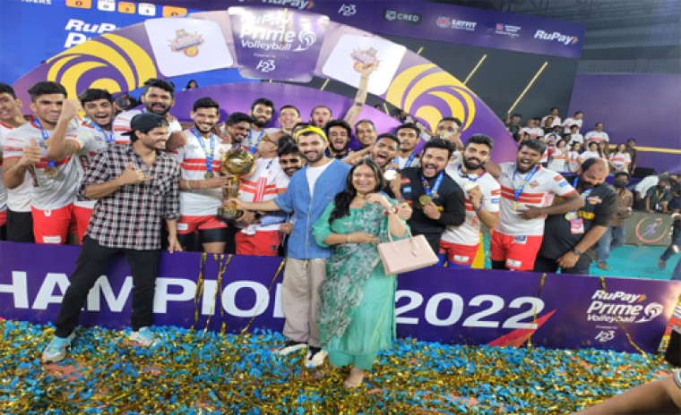 సినీ రంగంలో తనకంటు ప్రత్యేక స్థానాన్ని విజయ్ దేవరకొండ సొంతం చేసుకొన్నారు. దీంతో ఆయనకు వివిధ రంగాలలోనూ ఎనలేని ఆదరణ లభిస్తోంది. ఇదిలావుంటే గత కొన్నిరోజులుగా క్రీడాభిమానులను ఉర్రూతలూగించిన ప్రైమ్ వాలీబాల్ లీగ్-2022 ముగిసింది. కోల్ కతా థండర్ బోల్ట్స్ విజేతగా అవతరించింది. ఇవాళ హైదరాబాదులో జరిగిన ఫైనల్లో కోల్ కతా థండర్ బోల్ట్స్ 15-13, 15-10, 15-12తో అహ్మదాబాద్ డిఫెండర్స్ ను ఓడించింది. ఇదిలావుంటే టాలీవుడ్ యంగ్ హీరో విజయ్ దేవరకొండ విజేతలకు బహుమతి ప్రదానం చేశారు. డిఫరెంట్ గెటప్ తో వచ్చిన విజయ్ దేవరకొండ అందరినీ ఆకర్షించారు. విజయ్ దేదరకొండ ఈ కార్యక్రమానికి తల్లి, సోదరుడు ఆనంద్ లతో కలిసి విచ్చేశారు.