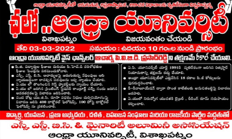 ఆంధ్ర యూనివర్సిటీ కాపాడుకో. ఈ యొక్క కార్యక్రమానికి విశాఖ జిల్లా జనసేన పార్టీ నాయకులు, జనసైనికులు, వీర మహిళలు, కార్పొరేటర్లు, వార్డు నాయకులు, అందరూ అధిక సంఖ్యలో పాల్గొని విజయవంతం చేయవలసిందిగా కోరుతున్నాం. 03.03.2022 ఉదయం 09.30గంటలకు జీవీఎంసీ గాంధీ, విగ్రహం, విశాఖపట్నం, ఉత్తరాంధ్ర జనసేన పార్టీ కార్యాలయం. యూనివర్సిటీలో జరుగుతున్నా అన్యాయాలు మరియు వీరి ఆంక్షలు అన్నిటిని కలిపి కడ పత్రం విడుదల చేస్తూ , జనసేన నాయకులూ దీక్షకు పిలుపునిచ్చారు.