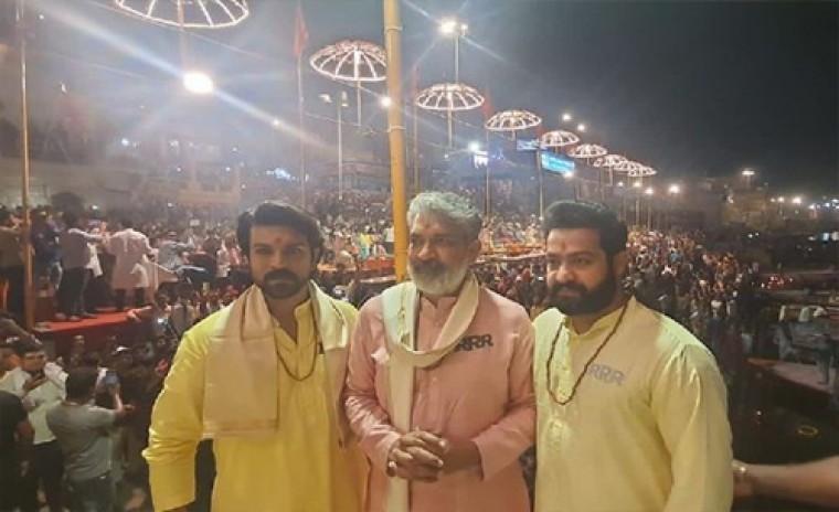 చిత్ర ప్రయోషన్ కోసం దేశ, విదేశాలను చుట్టేస్తున్న ఆర్ఆర్ఆర్ టీం స్థానిక ఆధ్యాత్మిక కేంద్రాలను కూడా సందర్శిస్తోంది. దాదాపు రూ.330 కోట్లకు పైగా బడ్జెట్ తో తెరకెక్కిన ఆర్ఆర్ఆర్ చిత్రం ప్రమోషన్ కార్యక్రమాలు ముమ్మరంగా సాగుతున్నాయి. దర్శకుడు రాజమౌళి, హీరోలు రామ్ చరణ్, ఎన్టీఆర్ దేశవ్యాప్తంగా వివిధ ప్రాంతాల్లో పర్యటిస్తూ ఆర్ఆర్ఆర్ కు ప్రచారం కల్పిస్తున్నారు. ఈ ఉదయం కోల్ కతాలో ప్రమోషన్ ఈవెంట్ లో పాల్గొన్న ఈ త్రయం... సాయంత్రానికి పవిత్ర నగరం వారణాసి చేరుకుంది. సంప్రదాయ దుస్తులు ధరించిన రాజమౌళి, ఎన్టీఆర్, రామ్ చరణ్ వారణాసిలో పవిత్ర గంగానదికి ప్రత్యేక పూజలు చేశారు. దీనికి సంబంధించిన ఫొటోలు సోషల్ మీడియాలో దర్శనమిస్తున్నాయి.