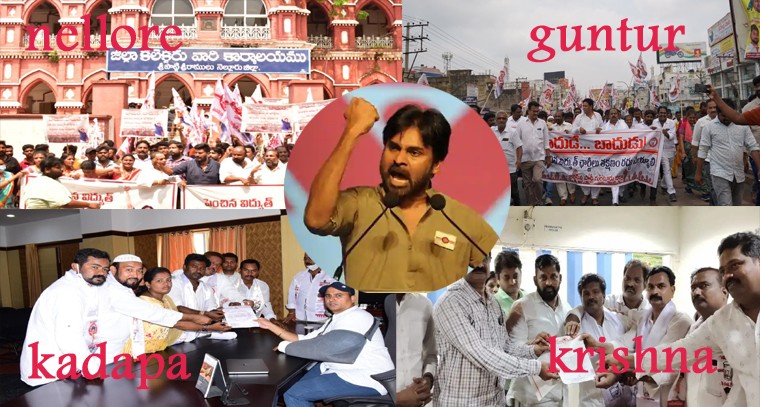 పెరిగిన కరెంటు చార్జీలు తగ్గించాలి అంటూ జనసేన అధినాయకుడు పవన్ కళ్యాణ్ ఇచ్చిన పిలుపు మేరకు , నిన్న రాష్ట్రమంతటా జనసేన నాయకులూ , కార్యకర్తలు ప్రతి నియోజకవర్గంలో ధర్నాలు చేసారు. అనంతరం కలెక్టర్ ని కలిసి వినతి పత్రాలు అందచేశారు. శ్రీ చెన్నారెడ్డి మనుక్రాంత్ రెడ్డి, శ్రీ శ్రీనివాస్ యాదవ్ గారు ఆధ్వర్యంలో నెల్లూరు జిల్లా , శ్రీ గాదె వెంకటేశ్వరరావు గారి ఆధ్వర్యంలో గుంటూరు జిల్లా , బండి రామకృష్ణ(RK) గారి ఆధ్వర్యంలో కృష్ణ జిల్లా, శ్రీ ముకర్రం చాన్ ఆధ్వర్యంలో కడప జిల్లా కేంద్రాలలో ర్యాలీలు , ధర్నాలు చేపట్టారు. ఈ సందర్భంగా జనసేన నాయకులూ మాట్లాడుతూ... ప్రజలకు కష్టం వస్తే అక్కడ జనసేన ఉంటుంది , దానిని దృష్టిలో పెట్టుకొని పరిపాలన కొనసాగించాలని వైసీపీ ప్రభుత్వాన్ని హెచ్చరించారు.