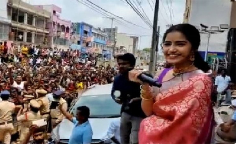 అందాల భామ అనుపమ పరమేశ్వరన్ రాకతో మచిలీపట్నం పులికించింది. టాలీవుడ్ అందాల నటి అనుపమ పరమేశ్వరన్ మచిలీపట్నం విచ్చేశారు. పట్టణంలో ఓ షాపింగ్ మాల్ లో ఏర్పాటు చేసిన కిడ్స్ వేర్ విభాగాన్ని అనుపమ ప్రారంభించారు. ఆమె రాకతో షాపింగ్ మాల్ వద్ద అభిమానులు పోటెత్తారు. ఫ్యాన్స్ భారీగా తరలిరావడంతో వారిని అదుపు చేసేందుకు పోలీసులు శ్రమించాల్సి వచ్చింది. అనుపమ బయటికి రాగానే, ఆమెను చూసి ఈలలు, కేకలతో హోరెత్తించారు. అందరికీ ఉగాది శుభాకాంక్షలు అంటూ అనుపమ చెప్పగా, ఫ్యాన్స్ కేరింతలు కొట్టారు. వారి ఉత్సాహాన్ని, అభిమానాన్ని చూసి అనుపమ కూడా చిరునవ్వులు చిందిస్తూ ఎంతో ఆస్వాదించారు.