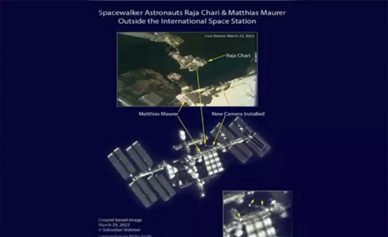 భూమి నుంచి మామూలు కంటితో చూస్తే అంతర్జాతీయ అంతరిక్ష కేంద్రం (ISS) కనిపించదు. పవర్ఫుల్ టెలిస్కోపులతో చూసినా చిన్న చీమ సైజులో మాత్రమే అది కనిపిస్తుంది. ఎందుకంటే భూమి నుంచి అది చాలా దూరంలో ఉంటూ... భూమి చుట్టూ తిరుగుతూ ఉంటుంది. అది ఏ సమయంలో ఎక్కడ తిరుగుతుందో చెప్పేందుకు ప్రత్యేక వెబ్సైట్లు ఉన్నాయి. తద్వారా అది ఎక్కడుందో తెలుసుకొని దాన్ని టెలిస్కోపుతో చూసేందుకు వీలు ఉంటుంది. ఐతే... సూర్యుడి ఎండ ఉన్నప్పుడు అది కనిపించదు. సూర్యాస్తమయం తర్వాత, సూర్యోదయానికి ముందు... అది మెరుస్తూ నక్షత్రం లాగా కనిపిస్తుంది. సరిగ్గా అలాంటి సమయంలో ఔత్సాహికులు దాన్ని చూసేందుకు ప్రయత్నిస్తారు. అలాంటి ఓ ఔత్సాహిక ఫొటోగ్రాఫర్ దాన్ని చూడటమే కాదు... స్పేస్ వాక్ ఫొటో కూడా తీశాడు. ఆస్ట్రో ఫొటోగ్రాఫరైన సెబాస్టియన్ వాల్ట్మెర్ (Sebastian Voltmer) గత వారం ఇది సాధించాడు. అంతర్జాతీయ అంతరిక్ష కేంద్రం చాలా పెద్దదే ఉంటుంది. అది రోజూ అంతరిక్షంలో చాలా వేగంగా దూసుకుపోతూ ఉంటుంది. కాబట్టి దానికి ఉన్న పార్టులకు ఎప్పుడూ ఏదో ఒక సమస్య వస్తూనే ఉంటుంది. ఆ పార్టులకు రిపేర్లు చెయ్యాల్సి ఉంటుంది. అది చాలా కష్టమైన పని. చెప్పాలంటే ప్రాణాంతకం. అలాంటి పనిని చేపట్టడమే స్పేస్ వాక్ అంటారు. ఈ స్పేస్ వాక్ చేసే వ్యోమగాములు ISS నుంచి బయటకు వచ్చి... పనిచేయాల్సి ఉంటుంది. అక్కడి గడ్డకట్టే చలి వాతావరణం ఏమాత్రం సహకరించదు. ఈ క్రమంలో ఏమాత్రం పట్టు జారినా ప్రాణాలు అంతరిక్షంలో కలిసిపోతాయి. అందువల్ల ఇలాంటి పనిని అరుదుగా చేస్తుంటారు. సెబాస్టియన్.. సరిగ్గా ఇద్దరు వ్యోమగాములు స్పేస్ వాక్ చేస్తున్న సమయంలో... ఫొటో తీశాడు. అలా ఇప్పటివరకూ ఎవరూ తియ్యలేదు. మార్చి 23న నాసా (NASA) వ్యోమగామి రాజా చారి (Raja Chari), యూరోపియన్ స్పేస్ ఏజెన్సీ (ESA)కి చెందిన వ్యోమగామి మాట్టియాస్ మారెర్ (Matthias Maurer)... దాదాపు 7 గంటలపాటూ ISS బయట ఉండి స్పేస్ వాక్ చేశారు. రకరకాల మెయింటెనెన్స్ పనులను పూర్తి చేశారు. వాళ్లు ఆ పనులు చేస్తున్న సమయంలో... వాళ్లను కాప్చర్ చేశాడు సెబాస్టియన్. మారెర్ సొంత పట్టణమైన జర్మనీలోని సాంక్త్ వెండెల్ నుంచి ఈ ఫొటో తీశాడు సెబాస్టియన్. "సూర్యాస్తమయం తర్వాత నేను స్పేస్వాక్ని చూశాను. వ్యోమగామి మాట్టియాస్ మారెర్.. ఏదో ఎక్కుతున్నారు. అక్కడ రాడ్ షేపులో ఉన్న నిర్మాణం.. కెనడార్మ్2 గా పిలిచే రోబో చెయ్యి ఉంది. మారెర్కి శుభాకాంక్షలు. ఇది చాలా ఉత్తేజం కలిగిస్తోంది" అని వాల్ట్మెర్ ట్వీట్ చేశాడు.