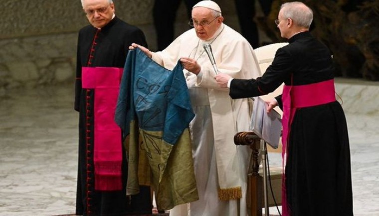 చిరిగిపోయిన ఉక్రెయిన్ జెండాను పోప్ ఫ్రాన్సిన్ ముద్దాడారు. ఎందుకో తెలుసా...? ఉక్రెయిన్ పై రష్యా కొనసాగిస్తున్న దాడులు ప్రపంచ దేశాలను కలవరపరుస్తున్నాయి. సామాన్య పౌరులను సైతం రష్యా సైనికులు ఊచకోత కోస్తున్నారు. బుచా పట్టణంలో దాదాపు 320 మంది పౌరులను చంపినట్టు ఆ నగర మేయర్ తెలిపారు. ప్రజలను రష్యా సైనికులు చంపడాన్ని తాను కళ్లారా చూశానని ఆయన చెప్పారు. మరోవైపు బుచా నగరంలో రష్యా దాడుల్లో ధ్వంసమైన ఉక్రెయిన్ జెండాను పోప్ ఫ్రాన్సిన్ ముద్దాడారు. వాటికన్ సిటీకి వచ్చిన ఆరుగురు చిన్నారులను ఆయన ఆహ్వానించారు. వారు తీసుకొచ్చిన జెండాను తీసుకుని ముద్దాడారు. యుద్ధాన్ని వెంటనే ముగించాలని మరోసారి హితవు పలికారు. ఉక్రెయిన్ ప్రజల కోసం ప్రార్థనలు చేయాలని పిలుపునిచ్చారు. తన వద్దకు వచ్చిన చిన్నారులకు ఒక పెద్ద చాక్లెట్, ఈస్టర్ గుడ్డును ఇచ్చారు.