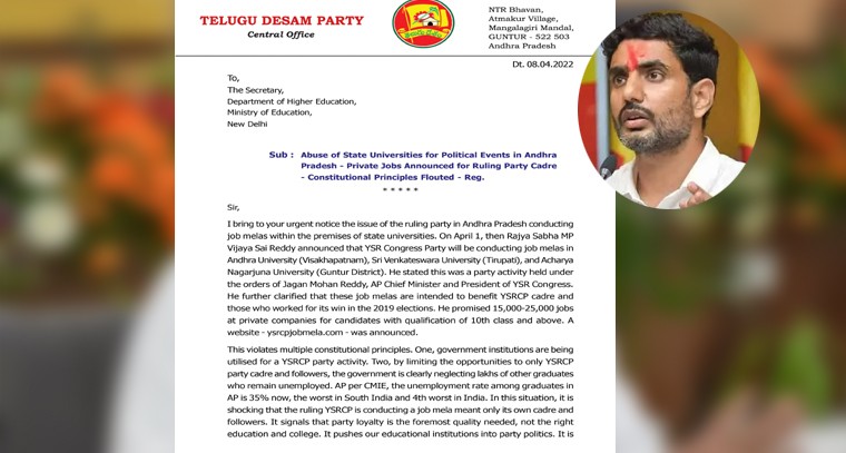 రాజకీయ అవసరాల కోసం రాష్ట్రంలో విశ్వవిద్యాలయాలను దుర్వినియోగం చేస్తున్నారంటూ యూనివర్సిటీ గ్రాంట్స్ కమిషన్(యూజీసీ) ఛైర్మన్ జగదీష్ కుమార్ గారు, కేంద్ర ఉన్నత విద్య శాఖ కార్యదర్శి సంజయ్ మూర్తి గారికి టీడీపీ యువ నాయకులూ నారా లోకేష్ లేఖ వ్రాసినట్లు తెలియచేసారు. ఈ సందర్భంగా ఆయన మాట్లాడుతూ... విశ్వవిద్యాలయాల్లో వైసిపి రాజకీయ పార్టీ కార్యకర్తలకు ప్రైవేటు ఉద్యోగాలంటూ జాబ్ మేళా ప్రకటించటం రాజ్యాంగ వ్యతిరేకం. విశ్వవిద్యాలయాల ప్రాంగణాల్లోనే రాజకీయ జాబ్ మేళాలు నిర్వహించేందుకు ఏర్పాట్లు చేస్తున్నారు. గత సార్వత్రిక ఎన్నికల్లో వైకాపా గెలుపు కోసం కృషి చేసిన వారికే ఈ జాబ్ మేళాలు నిర్వహిస్తున్నట్లు విజయసాయి ప్రకటించారు. రాజ్యాంగ సూత్రాలను ఉల్లంఘిస్తూ జరిగిన ఈ ఘటనల పట్ల తగు చర్యలు తీసుకోవాలి. లక్షలాదిమంది నిరుద్యోగ పట్టభద్రులను నిర్లక్ష్యం చేస్తూ ఉద్యోగ అవకాశాలను వైకాపా కార్యకర్తలకే పరిమితం చేస్తున్నారు. విద్యా సంస్థల నైతికత, విలువలు దిగజారకుండా తగు జాగ్రత్తలు తీసుకోవాలని కోరినట్లు తెలిపారు.