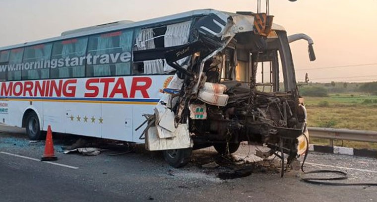ఎన్టీఆర్ జిల్లా పెనుగంచిప్రోలు మండల పరిధిలోని నవాబుపేట జాతీయ రహదారిపై ఘోర రోడ్డు ప్రమాదం చోటు చేసుకుంది. హైదరాబాద్ నుండి గుడివాడ వెళ్లే మార్నింగ్ స్టార్ ప్రైవేట్ ట్రావెల్స్ బస్సు నవాబుపేట జాతీయ రహదారి పై ముందు వెళ్తున్న లారీని ఓవర్ టేక్ చేస్తు అతి వేగంగా ఢీకొట్టడంతో డ్రైవర్ అక్కడికక్కడే మృతి చెందగా మరో 10 మందికి గాయాలు అయ్యాయి. గాయాలైన వారందరిని నందిగామ ప్రభుత్వ ఆసుపత్రికి తరలించారు.