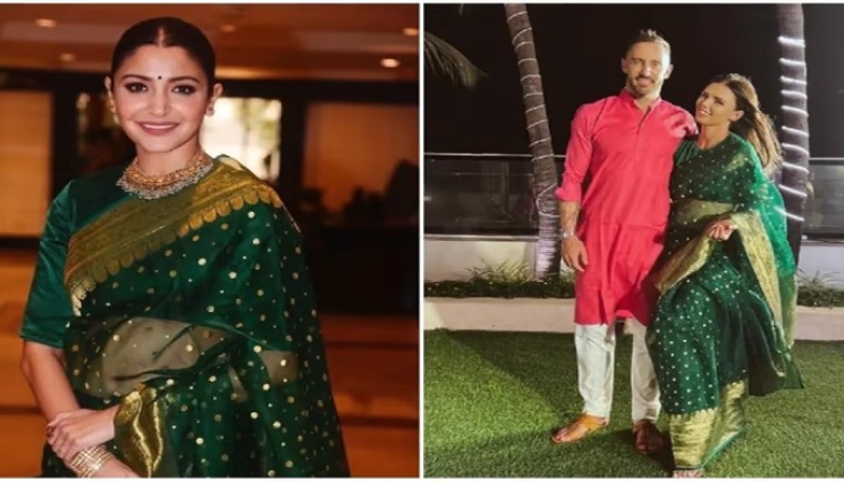డూప్లెసిస్ కుర్తా, పైజామా వేసుకోగా, ఆయన భార్య ఇమారి చీరకట్టుతో భారతీయ శైలిలో కనిపించారు. వేడుకలో పాల్గొన్న ఫొటోలను తమ పిల్లలతో సోషల్ మీడియా వేదికగా డూప్లెసిస్ దంపతులు పంచుకున్నారు. ఇమారీ కట్టిన చీరను చూసిన ప్రతి ఒక్కరూ ఆలోచనలో పడ్డారు. అచ్చంగా ఇలాంటి చీరను విరాట్ కోహ్లీ సతీమణి అనుష్క శర్మ 2018లో కట్టుకుని కనిపించారు. ఆకుపచ్చని పూలతో కూడిన చందేరి చీరలో ‘స్మితా పాటిల్ అవార్డ్ 34వ ఎడిషన్’ సందర్భంగా అనుష్క దర్శనమిచ్చారు. దీంతో నెటిజన్ల మధ్య కామెంట్ల పోటీ ఏర్పడింది.