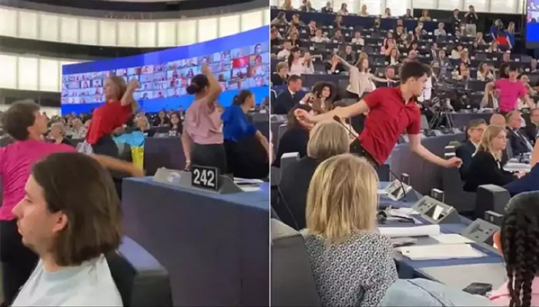 ఫ్రాన్స్లో ఉన్న స్ట్రాస్బర్గ్లో యూరోపియన్ యూనియన్ (EU) ప్రధాన కార్యాలయంలోని ఐరోపా పార్లమెంట్లో ఇటీవల నాలుగు రోజులు సమావేశాలు జరిగాయి. ఈ సందర్భంగా నాయకులు యూరప్ భవిష్యత్తు గురించి, పౌరుల సూచనలు, అభిప్రాయాల ఆధారంగా ఈయూ అభివృద్ధిపై చర్చించారు. ఇంత సీరియస్గా సాగిన సెషన్ ముగింపు సమయంలో ఏర్పాటు చేసిన డ్యాన్స్ షో అందరిని షాక్కు గురి చేసింది. సెషన్లో పాల్గొన్నవారికి వినోదం కోసం నృత్య ప్రదర్శనను ఏర్పాటు చేశారు. కొంతమంది అమ్మాయిలు పార్లమెంట్లోకి వచ్చి డ్యాన్స్లు వేశారు.