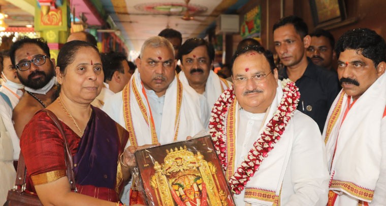విజయవాడ: ఇంద్రకీలాద్రిపై దుర్గమ్మను దర్శించుకున్న బీజేపీ జాతీయ అధ్యక్షుడు నడ్డా. దుర్గమ్మను దర్శించుకోవడం సంతోషంగా ఉంది.దేశ సేవ చేస్తున్న మాకు అమ్మవారి ఆశీర్వాదం ఉండాలి. అమ్మవారి మహిమ గురించి నేతలు చెప్పారు. అమ్మవారి కరుణ కటాక్షం అందరికీ ఉండాలి అని JP నడ్డా అన్నారు