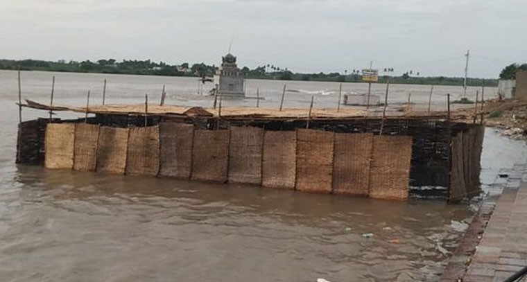 మంత్రాలయం: మంత్రాలయంలో తుంగభద్ర నది గురువారం ఉధృతంగా ప్రవహిస్తోంది. కర్నాటక వివిధ ప్రాంతాల్లో కురుస్తున్న వర్షాల కారణంగా తుంగభద్ర ఉగ్రరూపం దాల్చింది. మంత్రాలయంలోని గంగమ్మ ఆలయం దాటి మెట్లవరకు నీరు చేరాయి. శ్రీమఠం అధికారులు శ్రీ రాఘవేంద్రస్వామి ఆరాధన మహోత్సవాల సందర్భంగా మహిళా భక్తులు పుణ్య స్నానాలు చేసి దుస్తులు మార్చుకునేందుకు తాత్కాలికంగా ఏర్పాటు చేసిన తడికల సెడ్లు నీట మునిగాయి.