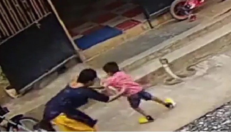 చిన్నారి బాలుడు స్కూలుకు వెళుతున్నాడు. తల్లి కూడా అతడికి తోడుగా ఇంటి ముందు వరకు వచ్చి చివరి మెట్టుపై ఆగిపోయి వీధి వైపు చూస్తోంది. బాలుడు కూడా వీధి వైపు చూస్తూ రోడ్డుపై కాలేశాడు. సరిగ్గా ఆ కాలు తాచుపాము మీద నుంచి రోడ్డుపై పడింది. వెంటనే తాచుపాము వెనక్కి వెళ్లి పైకిలేచి బాలుడ్ని కాటు వేయబోయింది. దీన్ని చూసిన ఆ మహిళ వేగంగా ముందుకు వచ్చేసి తన కుమారుడిని పక్కకు లాగేసి, ఎత్తుకుంది. దీంతో ఆ పాము ముందుకు వెళ్లిపోయింది. మహిళ స్పందించడం ఒకటి రెండు సెకన్లు ఆలస్యం అయినా పాము ఆ బాలుడ్ని కాటేసేదే. ఈ వీడియో సామాజిక మాధ్యమాలలోకి చేరడంతో పెద్ద వైరల్ అవుతోంది.