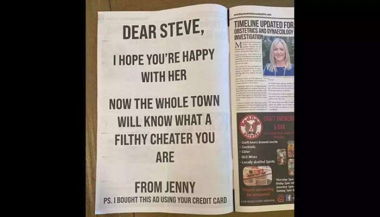 ఆ పేపర్ ప్రకటనలో "నువ్వు నీ గర్ల్ ఫ్రెండ్తో సంతోషంగా ఉన్నావని నేను ఆశిస్తున్నాను. ఇప్పుడు నువ్వు ఎంత మోసగాడివో పట్టణం మొత్తం తెలుసుకుంటారు. ఇట్లు జెన్నీ.." అని పేర్కొంది. అంతేకాదు ఈ యాడ్ను క్రెడిట్ కార్డు ఉపయోగించి కొనుగోలు చేశానని పేర్కొంది. దీంతో ఆ నగరంలోమ హాట్టాపిక్ అయింది. ఆ స్టీవ్, జెన్నీలు ఎవరో తెలుసుకోవాలని ప్రజలు ఆసక్తి చూపుతున్నారు. ఆ యాడ్ గురించి మరింత తెలుసుకోవడానికి ఆ పత్రిక యాజమాన్యానికి మెసెజ్లు పంపుతున్నారంట.