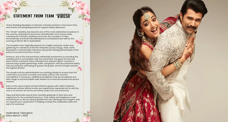Virosh - Wedding Reception పై పోలీస్ ఆంక్షల నేపథ్యంలో భద్రత ప్రధానంగా ఉంచాలని విరోష్ టీమ్ కు సూచించారు. దీని ఫలితంగా, మార్చి 4న హైదరాబాద్లో జరగనున్న రిసెప్షన్కు కొన్ని పరిమితులు విధించబడ్డాయి.ఇండియాలోనే క్రేజీ వెడ్డింగ్ ఈవెంట్గా విరోష్ వివాహ వేడుకలు ఘనంగా. ఈ పెళ్లి దేశవ్యాప్తంగా ప్రతి ఒక్కరి దృష్టిని ఆకర్షించింది.ఇంతకుముందు, హైదరాబాద్లోని ఒక హోటల్లో ఈ నెల 4న సాయంత్రం విజయ్ దేవరకొండ మరియు రశ్మిక మంధన వెడ్డింగ్ రిసెప్షన్ జరగనుంది. ఈ కార్యక్రమంలో కొద్దిమంది సన్నిహితులు మరియు పరిమిత సంఖ్యలో అతిథులు మాత్రమే పాల్గొననున్నారు. దీంతో పోలీసులు విరోష్ వెడ్డింగ్ రిసెప్షన్ కోసం కట్టుదిట్టమైన భద్రతా ఏర్పాట్లు చేశారు.పోలీసులు, ఇన్విటేషన్ లేకపోవడంవల్ల ఇతరులు, అభిమానులు రిసెప్షన్లో రావద్దని హెచ్చరిస్తున్నారు. ఈ విషయంపై విరోష్ జంట మాట్లాడుతూ, “మా భద్రత మీ క్షేమం కోసం ముఖ్యమే. మీరు ఎక్కడ ఉన్నా, మీ ఆశీర్వాదాలు మా వెంట ఉంటాయి” అని తెలియజేశారు.