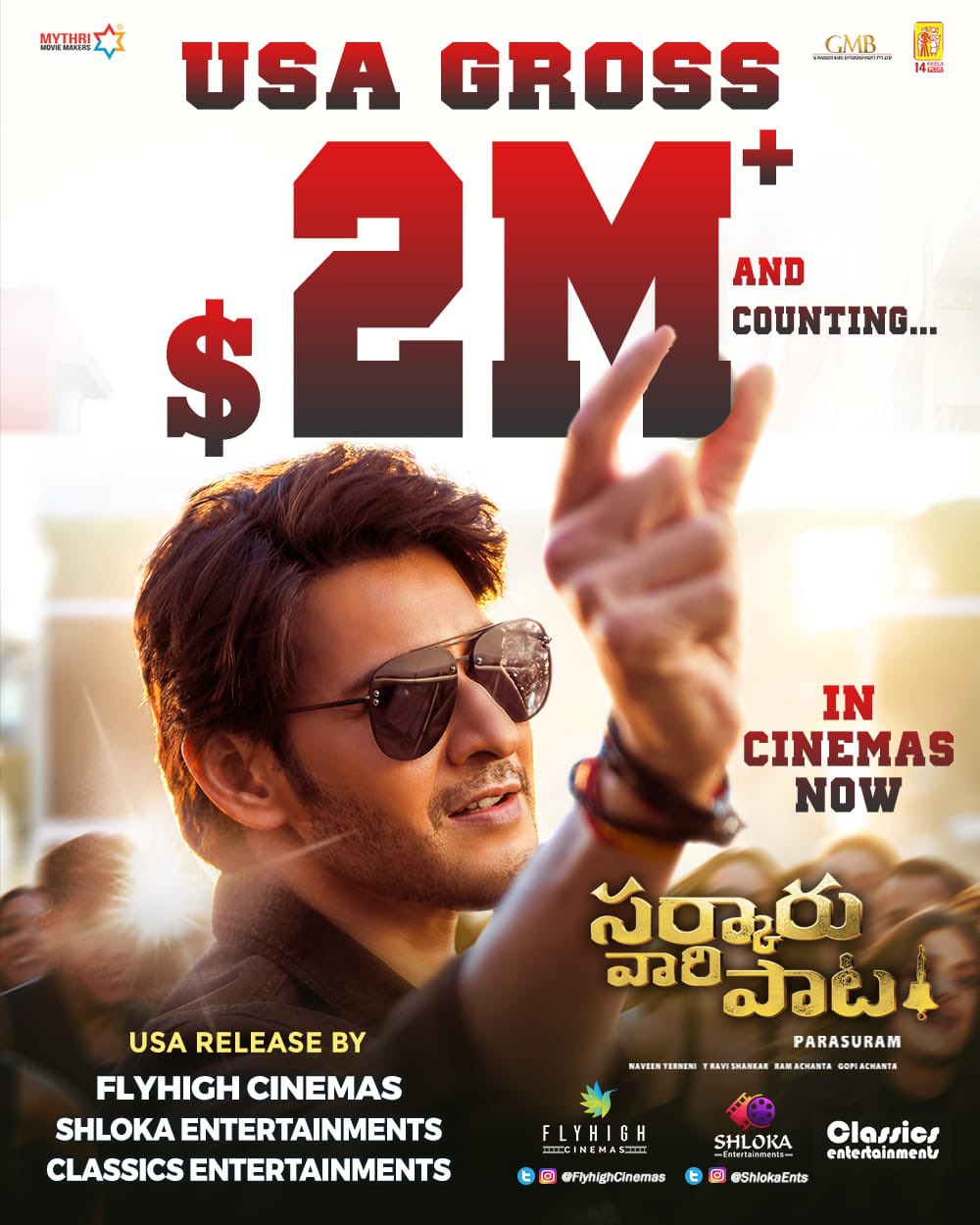 పరుశురామ్ దర్శకత్వంలో మహేష్ హీరోగా తెరకెక్కిన ఔట్ అండ్ ఔట్ మాస్ ఎంటర్టైనర్ "సర్కారు వారి పాట". థమన్ ఎస్ ఈ చిత్రానికి సంగీత దర్శకుడు. ఈ చిత్రం ఇటీవల US బాక్సాఫీస్ వద్ద $ 2 మిలియన్ల గ్రాస్ మార్క్ను దాటింది.