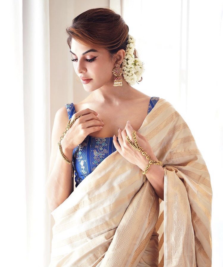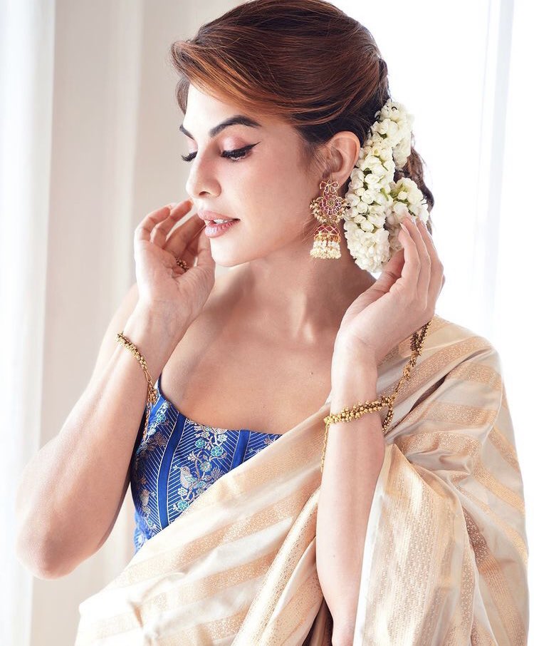 బాలీవుడ్ బ్యూటీ జాక్వెలిన్ ఫెర్నాండెజ్ చీరకట్టు అందాలతో మతిపోగొడుతోంది. ఎప్పుడూ లేనిది కొత్తగా తలలో మల్లెపూలు పెట్టుకొని సిగ్గుపడుతూ ఫొటోలకు ఫోజులివ్వడం నెటిజన్లను ఆకట్టుకుంటోంది. ఈ ముద్దుగుమ్మ ప్రభాస్ 'సాహో' మెరిసింది. స్పెషల్ సాంగ్ చిందేసింది. తాజాగా కన్నడ స్టార్ హీరో కిచ్చా సుదీప్ నటించిన పాన్ ఇండియన్ మూవీ 'విక్రాంత్ రోణ'లోనూ స్పెషల్ అప్పియరెన్స్ ఇచ్చింది. 'రా రా రక్కమ్మ' అంటూ ఐటమ్ సాంగ్ లో రెచ్చిపోయింది. ఇటీవలే విడుదల ఈ సాంగ్ కు ప్రేక్షకుల నుంచి మంచి స్పందన వస్తోంది. దీపం ఉండగానే ఇల్లు చక్కబెట్టుకోవాలి అనే చందంగా రక్కమ్మ సాంగ్ ట్రెండింగ్ లో ఉండగానే.... తలలో మల్లెపూలతో కవ్విస్తూ.. సౌత్ లో మరింత క్రేజ్ సంపాదించుకునే పనిలో పడింది జాక్వెలిన్.