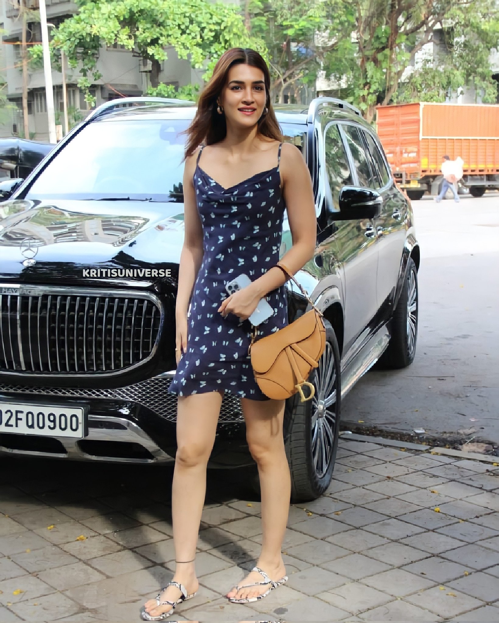 సిల్వర్ హూప్ చెవిపోగులు, లేత గోధుమరంగు డియోర్ బ్యాగ్తో తన రూపాన్ని యాక్సెసరైజ్ చేసింది కృతి. తన సిల్కీ ట్రెస్లను మిడ్-పార్టెడ్ హెయిర్స్టైల్లో కనిపించింది. పింక్ లిప్ గ్లాస్, డ్యూయి మేకప్ లుక్తో తన గ్లామ్ను మరింత పెంచింది. ఈ నీలిరంగు మినీ దుస్తులను అలియా భట్ బెస్ట్ ఫ్రెండ్ మేఘనా గోయల్ రూపొందించింది. ఈ ట్రెండీ డ్రెస్ టైమ్లెస్, ట్రాన్స్-సీజనల్ కూల్ గర్ల్ స్టేపుల్స్ను కలిగి ఉంది. డిజైనర్ వెబ్సైట్లో దీని ధర రూ.3,913గా ఉంది. కృతి ఒక జత స్ట్రాపీ ఫ్లాట్ చెప్పులతో తన వేషధారణను పూర్తి చేసింది. మిలియన్ డాలర్ల చిరునవ్వుతో ఫోటోలకు ఫోజులిచ్చింది.