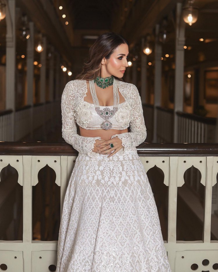 తాజా ఫోటోలలో, మలైకా వైట్ కలర్ లెహంగా ధరించి కనిపించింది. దీనితో, ఆమె ఫుల్ స్లీవ్స్ బ్యాక్లెస్ బ్లౌజ్ను జత చేసింది. లుక్ని పూర్తి చేయడానికి, మలైకా స్మోకీ మేకప్ చేసి, తన జుట్టును తెరిచి ఉంచింది. అదే సమయంలో మలైకా వైట్ అండ్ గ్రీన్ నెక్లెస్ ధరించి ఉంది.