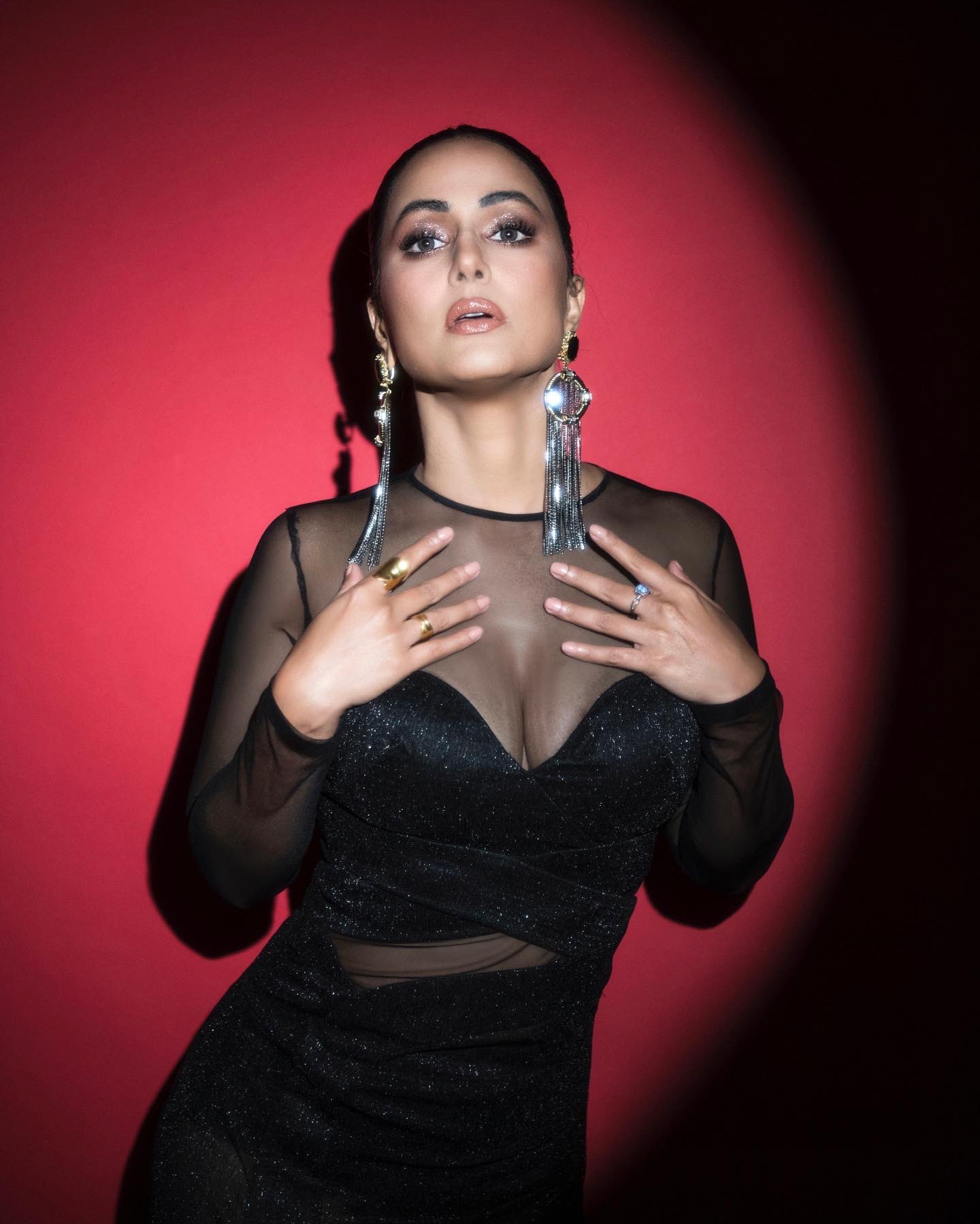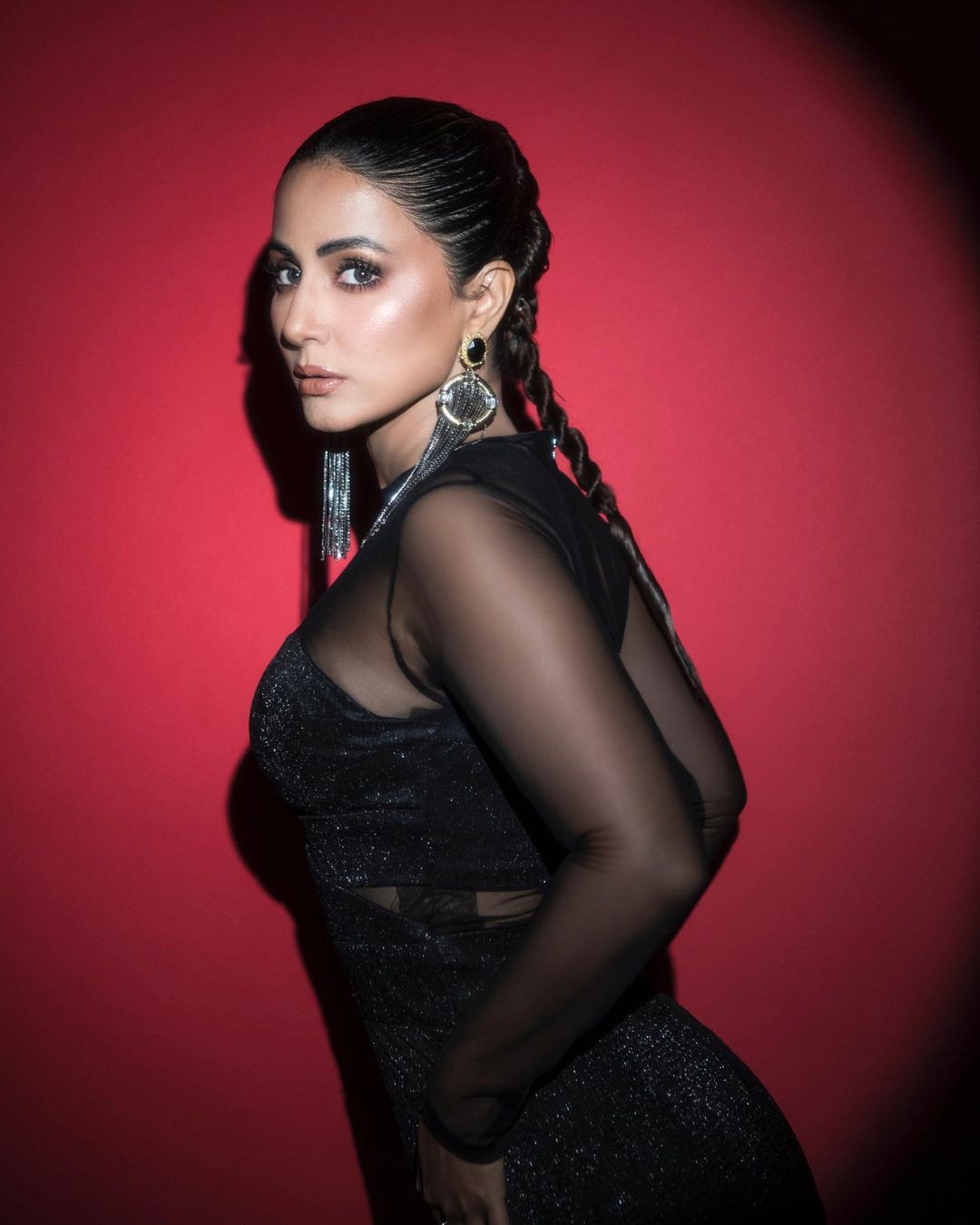 ఇన్స్టాగ్రామ్లో తన ఫోటోను పంచుకుంటూ హీనా ఖాన్ ఒకటి కంటే ఎక్కువ పోజులు ఇచ్చింది. తన లుక్స్ మరియు మేకప్ గురించి మాట్లాడుతూ, నటి నలుపు రంగు దుస్తులతో రాగి మెరిసే ఐ మేకప్ చేసింది. ఆమె బ్లాక్ లైనర్ మరియు మస్కారా అప్లై చేయడం ద్వారా కంటి అలంకరణను పూర్తి చేసింది. నటి లైట్ బ్రౌన్ షేడ్ లిప్స్టిక్ మరియు హై బబుల్ పోనీ టైల్లో చాలా అందంగా ఉంది.