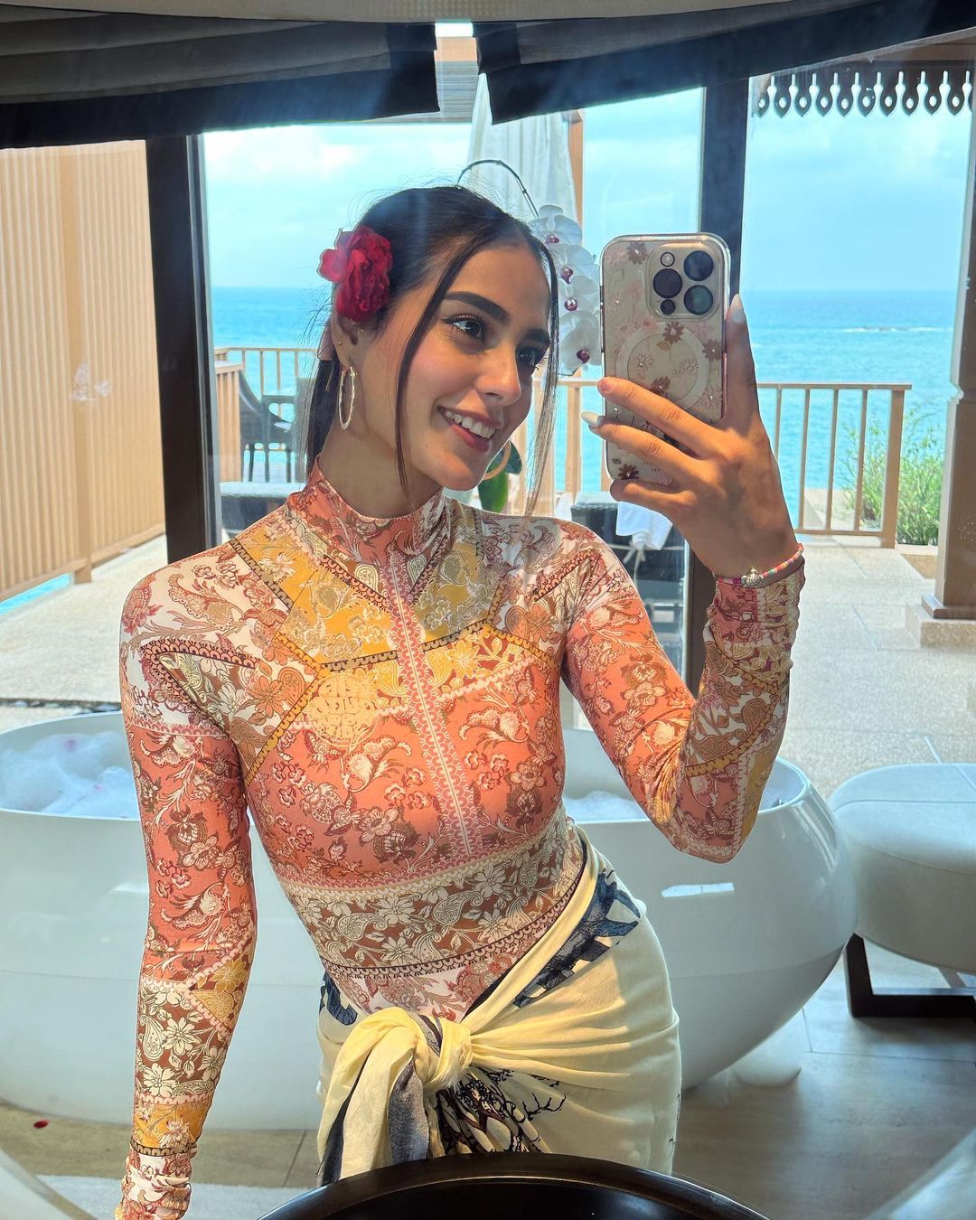 ఇక్రా ఇన్స్టాగ్రామ్లో చాలా యాక్టివ్గా ఉంటుంది. ఆమె వ్యక్తిగత మరియు వృత్తి జీవితం యొక్క సంగ్రహావలోకనాలు ఆమె పేజీలో అందుబాటులో ఉన్నాయి. ఈ సమయంలో నటి బాత్రూంలో ఫోటోను క్లిక్ చేసింది. ఈ ఫోటోలో, ఇక్రా బాత్రూంలో మిర్రర్ సెల్ఫీని క్లిక్ చేస్తోంది. ఈ సమయంలో, ఆమె బాడీకి సరిపోయే ఫుల్ స్లీవ్స్ దుస్తులు ధరించింది, దానితో పాటు ఆమె తన నడుముపై కండువా కూడా కట్టుకుంది. వాటి వెనుక బాత్ టబ్ మరియు అందమైన దృశ్యం కనిపిస్తుంది.ఇక్రా లుక్ గురించి మాట్లాడుతూ, ఆమె మేకప్తో తన లుక్ను పూర్తి చేసింది. ఆమె ఇక్కడ తన జుట్టును కట్టి, తన జుట్టులో ఎర్ర గులాబీని అలంకరించింది . అదే సమయంలో, ఆమె చెవులలో బంగారు హోప్ చెవిపోగులు ధరించింది.