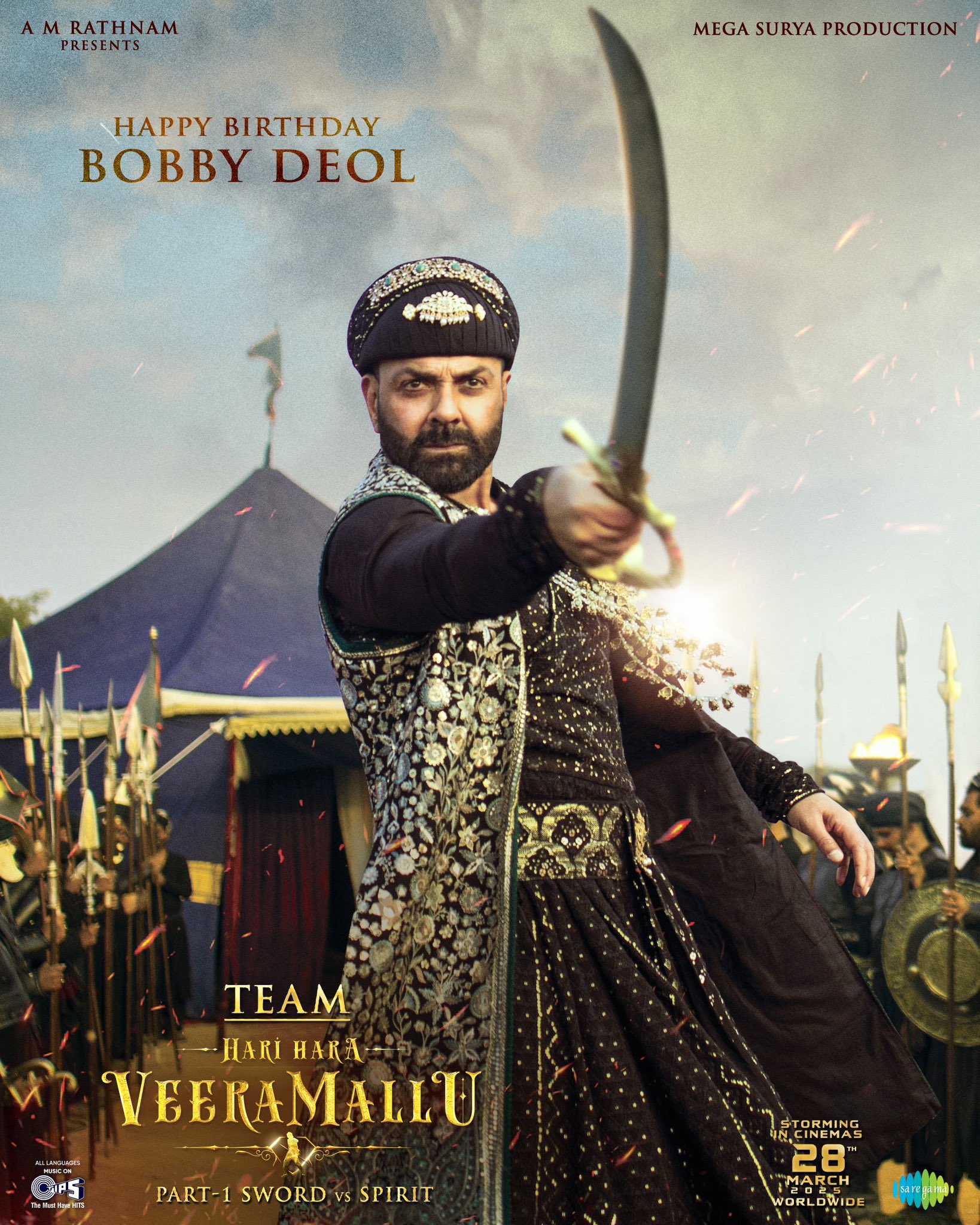 పవర్ స్టార్ పవన్ కల్యాణ్ హీరోగా నటిస్తున్న మోస్ట్ ప్రెస్టీజియస్ ప్రాజెక్ట్ హరిహర వీరమల్లు పిరియడికల్ బ్యాక్డ్రాప్లో వస్తున్న ఈ సినిమా రెండు పార్ట్లుగా రాబోతున్న విషయం తెలిసిందే. ఇప్పటికే ఫస్ట్ పార్ట్ శరవేగంగా షూటింగ్ కంప్లీట్ చేసుకుంటుంది. మరోవైపు ఈ సినిమాను 2025 మార్చి 28న ప్రేక్షకుల ముందుకు తీసుకురాబోతున్నట్లు చిత్రబృందం ఇప్పటికే ప్రకటించింది. ఇక విడుదల తేదీ దగ్గర పడడంతో ప్రమోషన్స్ స్టార్ట్ చేశారు మేకర్స్. ఇప్పటికే మూవీ నుంచి పవన్ కళ్యాణ్ పాడిన ఫస్ట్ సింగిల్ 'మాట వినాలి' అనే పాటను వదిలిన చిత్రబృందం తాజాగా విలన్ అప్డేట్ ఇచ్చింది. ఈ సినిమాలో విలన్ పాత్రలో నటిస్తున్న బాలీవుడ్ నటుడు బాబీ డియోల్ బర్త్డే నేడు. ఈ సందర్భంగా మూవీ నుంచి ఆయనకు పుట్టినరోజు శుభాకాంక్షలు తెలుపుతూ.. బాబీ ఫస్ట్ లుక్ని విడుదల చేసింది. జ్యోతి కృష్ణ ఈ సినిమాకు దర్శకత్వం వహిస్తుండగా.. రెండు భాగాలుగా వస్తున్న ఈ చిత్రం మొదటి పార్ట్ 'హరిహర వీరమల్లు పార్ట్: స్వార్డ్ వర్సెస్ స్పిరిట్' పేరుతో ప్రేక్షకుల రాబోతున్నది. ఈ చిత్రంలో నిధి అగర్వాల్ ఫీ మేల్ లీడ్ రోల్లో నటిస్తోంది. బాలీవుడ్ నటుడు అర్జున్ రాంపాల్, నర్గీస్ ఫక్రీ, బాబీ డియోల్ కీలక పాత్రలు పోషిస్తున్నారు. లెజెండరీ మ్యూజిక్ డైరెక్టర్ ఎంఎం కీరవాణి ఈ చిత్రానికి మ్యూజిక్, బ్యాక్ గ్రౌండ్ స్కోర్ అందిస్తున్నాడు.