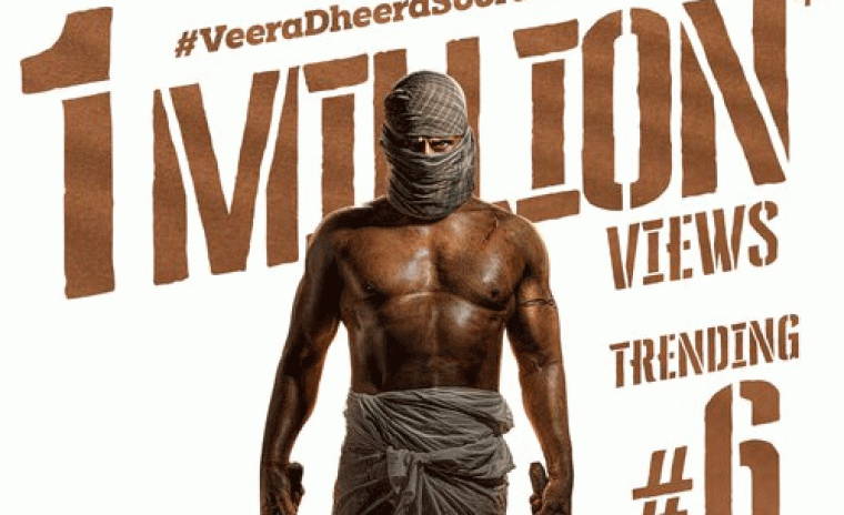 బహుముఖ నటుడు విక్రమ్ తదుపరి చిత్రం 'వీర ధీర శూరన్' లో కనిపించనున్నాడు. దీనికి చిత్త ఫేమ్ SU అరుణ్ కుమార్ దర్శకత్వం వహిస్తున్నారు. ఈ గ్యాంగ్స్టర్ యాక్షన్ డ్రామాలో దుషారా విజయన్ కథానాయికగా నటిస్తుంది. ఈ సినిమాలో SJ సూర్య, సిద్ధిక్ మరియు సూరజ్ వెంజరమూడుకీలక పాత్రలో నటిస్తున్నారు. ఈ చిత్రంలో SJ సూర్య ప్రతినాయకుడిగా, పోలీసుగా నటించారు. ఇటీవలే మేకర్స్ ఈ సినిమా యొక్క తెలుగు వెర్షన్ టీజర్ ని విడుదల చేసారు. తాజాగా ఇప్పుడు ఈ సినిమా టీజర్ వన్ మిలియన్ వ్యూస్ తో యూట్యూబ్ లో ట్రేండింగ్ 6వ పోసిషన్ లో ఉన్నట్లు సమాచారం. ఈ విషయాన్ని తెలియజేసేందుకు చిత్ర బృందం సోషల్ మీడియాలో సరికొత్త పోస్టర్ ని విడుదల చేసింది. వీర ధీర శూరన్ పార్ట్ 2 షూటింగ్ పూర్తయింది, ప్రస్తుతం పోస్ట్ ప్రొడక్షన్ పనులు శరవేగంగా జరుగుతున్నాయి. హెచ్ఆర్ పిక్చర్స్ బ్యానర్పై రియా శిబు వీర ధీర శూరన్ని నిర్మిస్తున్నారు. ఈ సినిమాకి జివి ప్రకాష్ కుమార్ స్వరాలు సమకూరుస్తున్నారు. చిత్ర సాంకేతిక బృందంలో జి.వి.ప్రకాష్ సంగీతం, తేని ఈశ్వర్ సినిమాటోగ్రాఫర్, ప్రసన్న జికె ఎడిటర్, సిఎస్ బాలచందర్ ఆర్ట్ డైరెక్టర్గా ఉన్నారు. వీర ధీర శూరన్ మార్చి 27న విడుదల కానుంది.