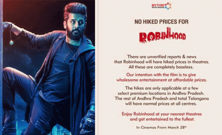 నితిన్ మరియు శ్రీలీల నటించిన రాబిన్హుడ్ సినిమా సింగిల్ స్క్రీన్లలో 50 మరియు మల్టీప్లెక్స్స్ వద్ద 75 పెంపునుకు ఆంధ్రప్రదేశ్ ప్రభుత్వం ఆమోదించిన తర్వాత సోషల్ మీడియాలో వైరల్గా మారింది. సినీ ప్రేమికులు ఈ చర్యను ప్రశ్నించారు, మీడియం బడ్జెట్తో చేసిన ఈ చిత్రానికి ధర పెంపు అవసరమా అని అడిగారు. టికెట్ ధరల పెంపుపై పెరుగుతున్న ఆగ్రహాన్ని గమనించిన రాబిన్హుడ్ మేకర్స్ ఈ మధ్యాహ్నం ఒక వివరణ జారీ చేశారు. రాబిన్హుడ్ థియేటర్లలో ధరలను పెంచే ధృవీకరించని నివేదికలు మరియు వార్తలు ఉన్నాయి. ఇవన్నీ పూర్తిగా నిరాధారమైనవి. ఆంధ్రప్రదేశ్లోని కొన్ని ఎంపిక చేసిన ప్రీమియం ప్రదేశాలలో మాత్రమే ఈ పెంపు వర్తిస్తుంది. మిగిలిన ఆంధ్రప్రదేశ్ మరియు మొత్తానికి కాదు అని రాబిన్హుడ్ మేకర్స్ వెల్లడించారు. రాబిన్హుడ్ ఒక హీస్ట్ కామెడీ ఎంటర్టైనర్ ఇందులో స్టార్ ఆస్ట్రేలియన్ క్రికెటర్ డేవిడ్ వార్నర్ కూడా ప్రత్యేక అతిధి పాత్రలో ఉన్నారు. వెంకీ కుడుములా దర్శకత్వం వహించిన ఈ సినిమా మైథ్రీ మూవీ మేకర్స్ బ్యానర్ క్రింద నిర్మించబడుతుంది. మార్చి 28న విడుదల కానున్న ఈ చిత్రానికి జివి ప్రకాష్ కుమార్ సౌండ్ట్రాక్ అందించారు.