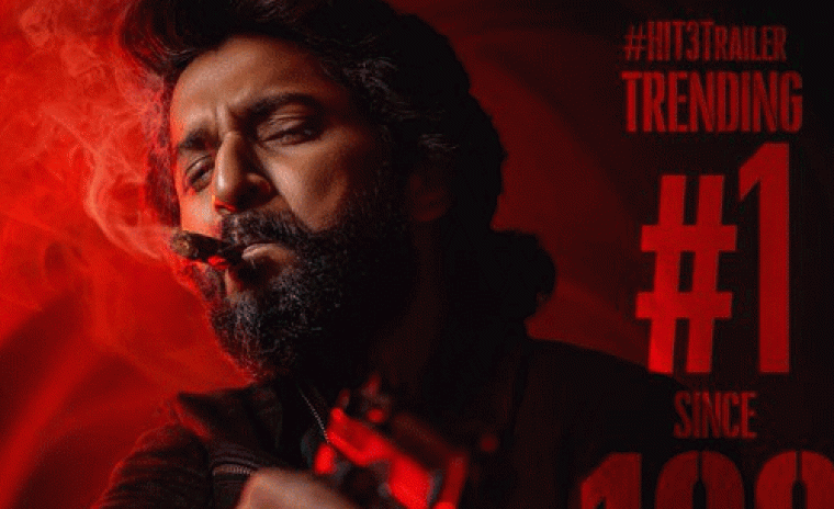 టాలీవుడ్ నటుడు నేచురల్ స్టార్ నాని ఎంతో ఆసక్తిగా ఎదురుచూస్తున్న క్రైమ్ యాక్షన్ థ్రిల్లర్ హిట్: ది 3వ కేసులో ప్రధాన పాత్రలో నటిస్తున్నారు మరియు నిర్మిస్తున్నారు. ఈ చిత్రం హిట్ ఫ్రాంచైజీలో మూడవ విడతను సూచిస్తుంది మరియు శ్రీనిధి శెట్టి ప్రధాన పాత్రలో నటిస్తుంది. ఈ సినిమాలో నాని పోలీస్ ఆఫీసర్గా తన తీవ్రమైన పాత్రతో ఆకట్టుకోవడానికి మే 1న ప్రేక్షకుల ముందుకు రానున్నారు. ఇటీవలే విడుదలైన ఈ సినిమా ట్రైలర్ కి సాలిడ్ రెస్పాన్స్ లభించింది. తాజాగా చిత్ర బృందం ఈ సినిమా యొక్క ట్రైలర్ యూట్యూబ్ లో విడుదలైన 100 గంటల నుండి ట్రేండింగ్ వన్ పోసిషన్ లో ఉన్నట్లు ప్రకటించింది. ఈ విషయాన్ని తెలియజేసేందుకు ప్రొడక్షన్ హౌస్ సోషల్ మీడియాలో సరికొత్త పోస్టర్ ని విడుదల చేసింది. సాంకేతిక బృందంలో ఎడిటర్గా కార్తీక శ్రీనివాస్ ఆర్, ప్రొడక్షన్ డిజైనర్ శ్రీ నాగేంద్ర తంగల ఉన్నారు. సైలేష్ కోలను దర్శకత్వం వహించిన హిట్ 3 విస్తరిస్తున్న కాప్ విశ్వంలో భాగం మరియు నాని భారీ బడ్జెట్లో నిర్మిస్తున్నారు. ఈ సినిమాలో రావు రమేష్, కోమలీ ప్రసాద్, సూర్య శ్రీనివాస్ మరియు ఇతరులు కీలక పాత్రల్లో నటించారు. సను జాన్ వర్గీస్ కెమెరాను క్రాంక్ చేస్తున్నాడు మరియు కార్తికా శ్రీనివాస్ ఆర్ ఈ చిత్రం కోసం ఎడిటింగ్ను నిర్వహిస్తున్నారు. మిక్కీ జె మేయర్ ఈ చిత్రానికి సంగీత దర్శకుడుగా ఉన్నారు.