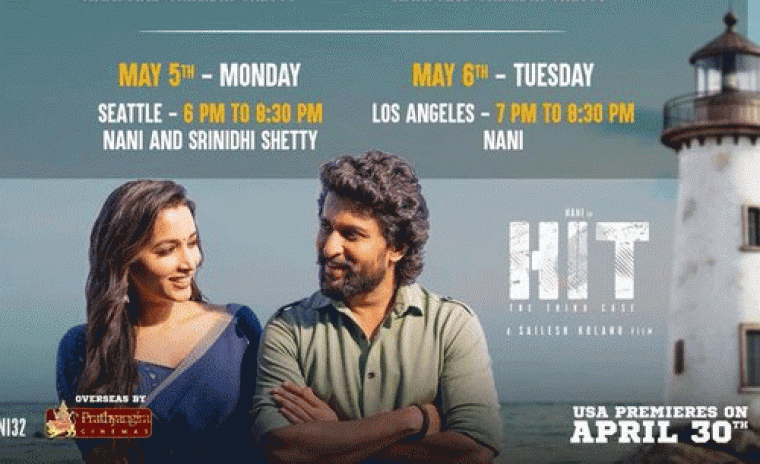 నేచురల్ స్టార్ నాని ఎంతో ఆసక్తిగా ఎదురుచూస్తున్న క్రైమ్ యాక్షన్ థ్రిల్లర్ హిట్: ది 3వ కేసులో పోలీస్ ఆఫీసర్గా తన తీవ్రమైన పాత్రతో ప్రేక్షకులను ఆకట్టుకోవడానికి సిద్ధంగా ఉన్నారు. ఈ చిత్రం హిట్ ఫ్రాంచైజీలో మూడవ విడతను సూచిస్తుంది మరియు శ్రీనిధి శెట్టి ప్రధాన పాత్రలో నటిస్తుంది. ఇటీవలే విడుదలైన ఈ సినిమా ప్రమోషనల్ కంటెంట్ కి సాలిడ్ రెస్పాన్స్ లభించింది. ఈ చిత్రం యొక్క ఓవర్సీస్ రైట్స్ ని ప్రత్యంగిరా సినిమాస్ బ్యానర్ సొంతం చేసుకున్న సంగతి తెలిసిందే. తాజాగా చిత్ర బృందం ఈ సినిమా యొక్క ప్రమోషన్స్ ని USAలో కూడా ప్రారంభించటానికి సిద్ధంగా ఉన్నట్లు ప్రకటించింది. USA టూర్ డీటెయిల్స్ కి మేకర్స్ వెల్లడించారు. ఈ విషయాన్ని తెలియజేసేందుకు ప్రొడక్షన్ హౌస్ సోషల్ మీడియాలో సరికొత్త పోస్టర్ ని విడుదల చేసింది. సాంకేతిక బృందంలో ఎడిటర్గా కార్తీక శ్రీనివాస్ ఆర్, ప్రొడక్షన్ డిజైనర్ శ్రీ నాగేంద్ర తంగల ఉన్నారు. సైలేష్ కోలను దర్శకత్వం వహించిన హిట్ 3 విస్తరిస్తున్న కాప్ విశ్వంలో భాగం మరియు నాని భారీ బడ్జెట్లో నిర్మిస్తున్నారు. హిట్: 3వ కేసు మే 1, 2025న విడుదల కానుంది. ఈ సినిమాలో రావు రమేష్, కోమలీ ప్రసాద్, సూర్య శ్రీనివాస్ మరియు ఇతరులు కీలక పాత్రల్లో నటించారు. మిక్కీ జె మేయర్ ఈ చిత్రానికి సంగీత దర్శకుడు.