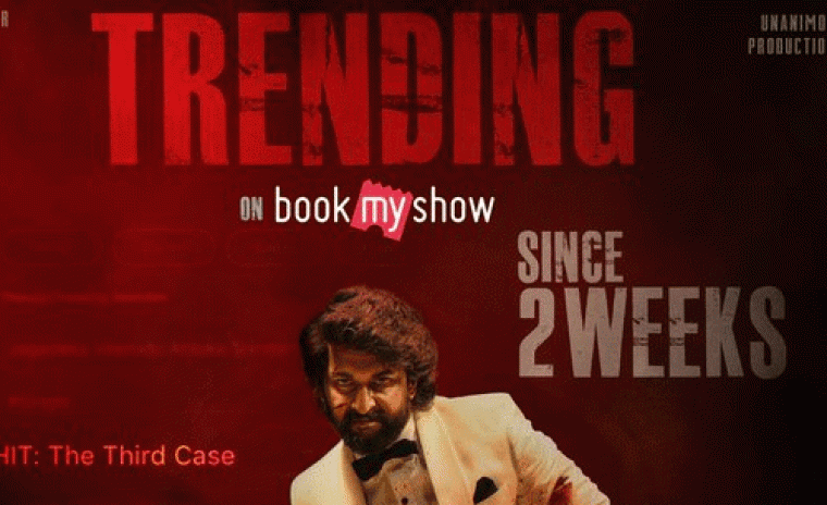 నటుడిగా మరియు నిర్మాతగా నేచురల్ స్టార్ నాని మరోసారి 'హిట్ 3' తో హిట్ ని అందుకున్నారు. సైలేష్ కోలను దర్శకత్వం వహించిన ఈ చిత్రం పాజిటివ్ సమీక్షలు మరియు ప్యాక్ చేసిన ప్రదర్శనలకు ప్రారంభించబడింది. ఈ చిత్రంలో శ్రీనిధి శెట్టి మహిళా ప్రధాన పాత్రలో నటిస్తుంది. తాజాగా ఇప్పుడు ఈ చిత్రం బుక్ మై షోలో గత రెండు వారాలుగా ట్రేండింగ్ లో ఉన్నట్లు మేకర్స్ ప్రకటించారు. ఈ విషయాన్ని తెలియజేసేందుకు మూవీ మేకర్స్ సోషల్ మీడియాలో సరికొత్త పోస్టర్ ని విడుదల చేసారు. హిట్ ఫిల్మ్ యొక్క సీక్వెల్ గా వచ్చిన ఈ చిత్రంలో రావు రమేష్, కోమలీ ప్రసాద్, సూర్య శ్రీనివాస్ మరియు ఇతరులు కీలక పాత్రల్లో నటించారు. సాంకేతిక బృందంలో ఎడిటర్గా కార్తీక శ్రీనివాస్ ఆర్, ప్రొడక్షన్ డిజైనర్ శ్రీ నాగేంద్ర తంగల, సను జాన్ వర్గీస్ కెమెరాను క్రాంక్ చేస్తున్నాడు. ఈ యాక్షన్ థ్రిల్లర్ కి మిక్కీ జె మేయర్ సంగీతం అందిస్తున్నారు. వాల్ పోస్టర్ సినిమా మరియు యూనానిమ్స్ ప్రొడక్షన్స్ కింద ప్రశాంతి టిపిర్నేని ఈ చిత్రాన్ని నిర్మించారు.
