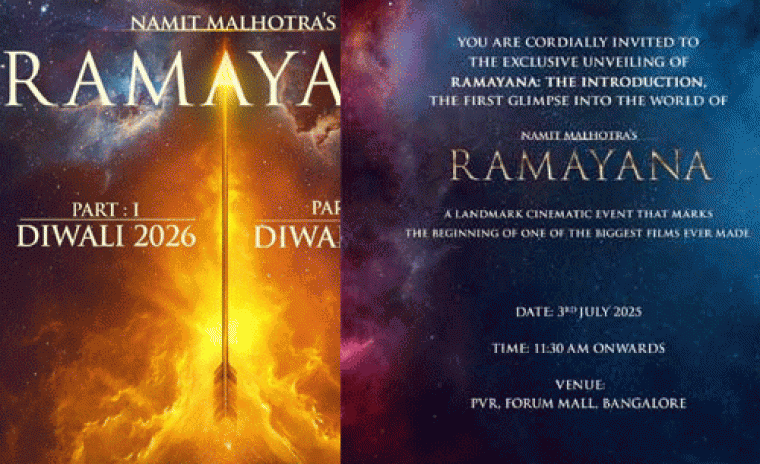 బాలీవుడ్ డైరెక్టర్ నితేష్ తివారీ యొక్క 'రామాయణం' చుట్టూ ఉన్న సంచలనం భారీగా ఉంది. భారతీయ సినిమా యొక్క అత్యంత ప్రతిష్టాత్మక పౌరాణిక పురాణాలలో ఒకటిగా రెండు-భాగాల సాగాలో రణబీర్ కపూర్ లార్డ్ రామాగా మరియు సీతాగా సీతాగా నటించారు. తాజా అప్డేట్ ప్రకారం, టైటిల్ లోగో మరియు ఈ చిత్రం నుండి ఒక చిన్న గ్లింప్సెని మేకర్స్ జూలై 3, 2025న విడుదల చేయటానికి ప్లాన్ చేసారు. ఇటీవల తిరిగి సెన్సార్ చేయబడిన మరియు పూర్తి మూడు నిమిషాలకు విస్తరించిన అనౌన్స్మెంట్ వీడియో గొప్ప ఫస్ట్ లుక్ అందిస్తుందని భావిస్తున్నారు. ఈ టైటిల్ లోగో జూన్ 3న ఉదయం 11:30 గంటలకు బెంగళూరులోని పివిఆర్ ఫోరం మాల్లో విడుదల కానుంది. ఈ ఈవెంట్ కి మొత్తం బృందం హాజరవుతుందని భావిస్తున్నారు. సన్నీ డియోల్, యష్, కజల్ అగర్వాల్, రవి దుబే, అరుణ్ గోవిల్ మరియు లారా దత్తా కీలక పాత్రల్లో నటిస్తున్నారు. ఈ చిత్రానికి సంగీతాన్ని AR రెహ్మాన్ మరియు హన్స్ జిమ్మెర్ స్వరపరిచారు. నమీట్ మల్హోత్రా మరియు యష్ మద్దతుతో రామాయణం దీపావళి 2026, దీపావళి 2027 లలో రెండు భాగాలుగా విడుదల కానుంది.