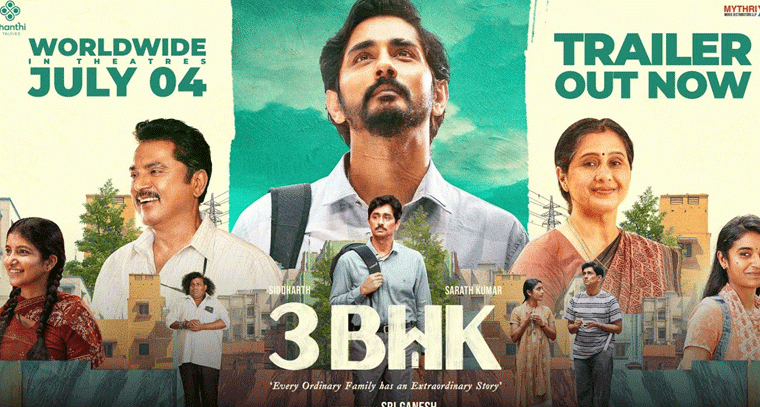సిద్ధార్థ్ నటించిన కుటుంబకథా చిత్రం '3BHK' 2025 ఆగస్టు 1వ తేదీ నుండి Amazon Prime Video లో స్ట్రీమింగ్కి అందుబాటులోకి రానుంది. తెలుగు, తమిళ భాషల్లో ఆడియో అందుబాటులో ఉంటుందని తెలిపారు. విదేశాల్లో ఈ సినిమా సింప్లీ సౌత్ అనే ప్లాట్ఫారమ్ ద్వారా స్ట్రీమింగ్ కానుంది. సొంత ఇంటి కల నెరవేర్చుకునే సమయంలో ఒక మధ్యతరగతి కుటుంబం ఎదుర్కొనే సమస్యలను ఈ చిత్రం చూపిస్తుంది. ఈ చిత్రం జూలై 4న థియేటర్లలో విడుదలైంది.కథ ప్రధానంగా వాసుదేవ్ (శరత్ కుమార్) మధ్యతరగతి కుటుంబం జీవితం గురించి. హైదరాబాద్లో ఒక చిన్న కంపెనీలో అకౌంటెంట్గా పనిచేస్తూ కుటుంబాన్ని నడిపిస్తున్న అతడు, ఎప్పటికైనా సొంత ఇల్లు కట్టుకోవాలని కలలు కనుతున్నాడు. ఆ కలను సాకారం చేసుకునేందుకు అనేక ప్రయత్నాలు చేస్తాడు, కానీ సక్సెస్ అవ్వలేకపోతున్నాడు.తన కలను తన కొడుకు ప్రభు (సిద్ధార్థ్) ద్వారా నెరవేర్చాలని నిర్ణయించుకున్నాడు. అయితే ప్రభు తన కెరీర్లో సవాళ్లను ఎదుర్కొంటున్నాడు. 34 ఏళ్ల వయస్సులో సరైన ఉద్యోగం లేక తండ్రిపై ఆధారపడుతూ జీవిస్తున్నాడు. ఈ నేపథ్యంలో ప్రభు తండ్రి కలను నెరవేర్చడానికి ఏం చేశాడో, అలాగే అతడు ఎదుర్కొన్న సవాళ్లు ఏమిటో కథలో ముల్యమైన అంశాలు.